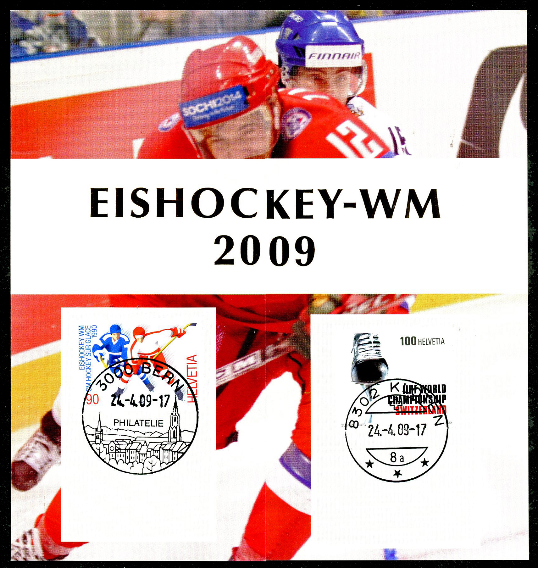 4 page brochure issued with the release of swi-20090305-s-001. The first 2 pages are half width. The brochure also contains a copy of swi-19900306-s-001, the stamp for the previous IIHF tournament held in Switzerland in 1990. The 2 stamps are date stamped with the opening day of the tournament: April 24, 2009.