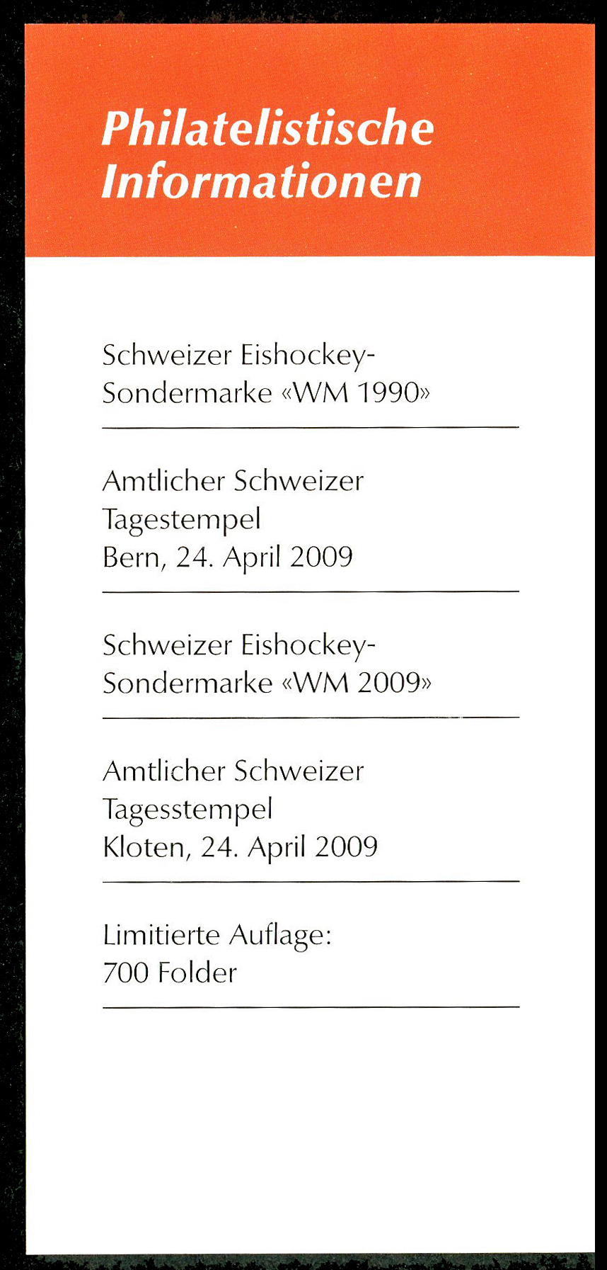 Click here for higher resolution image | First day of issue: April 24, 2009 Occasion: 2009 Men's World Ice Hockey Championships,2009,,Switzerland Width: 141 mm Height: 148 mm Quantity printed: 700 Location: Ice Hockey Volume LXXXIX Stamp ID = 9206 4 page brochure issued with the release of swi-20090305-s-001. The first 2 pages are half width. The brochure also contains a copy of swi-19900306-s-001, the stamp for the previous IIHF tournament held in Switzerland in 1990. The 2 stamps are date stamped with the opening day of the tournament: April 24, 2009. From Linn's "Stamp Issuing Entities Of The World" page. Switzerland (1850-) Stamp-issuing status: active; Population: 7,248,984 (1997 estimate). A land-locked federation in central Europe, situated between France, Germany, Austria and Italy. The country has three official languages: German, French and Italian.In addition from Wikepedia |