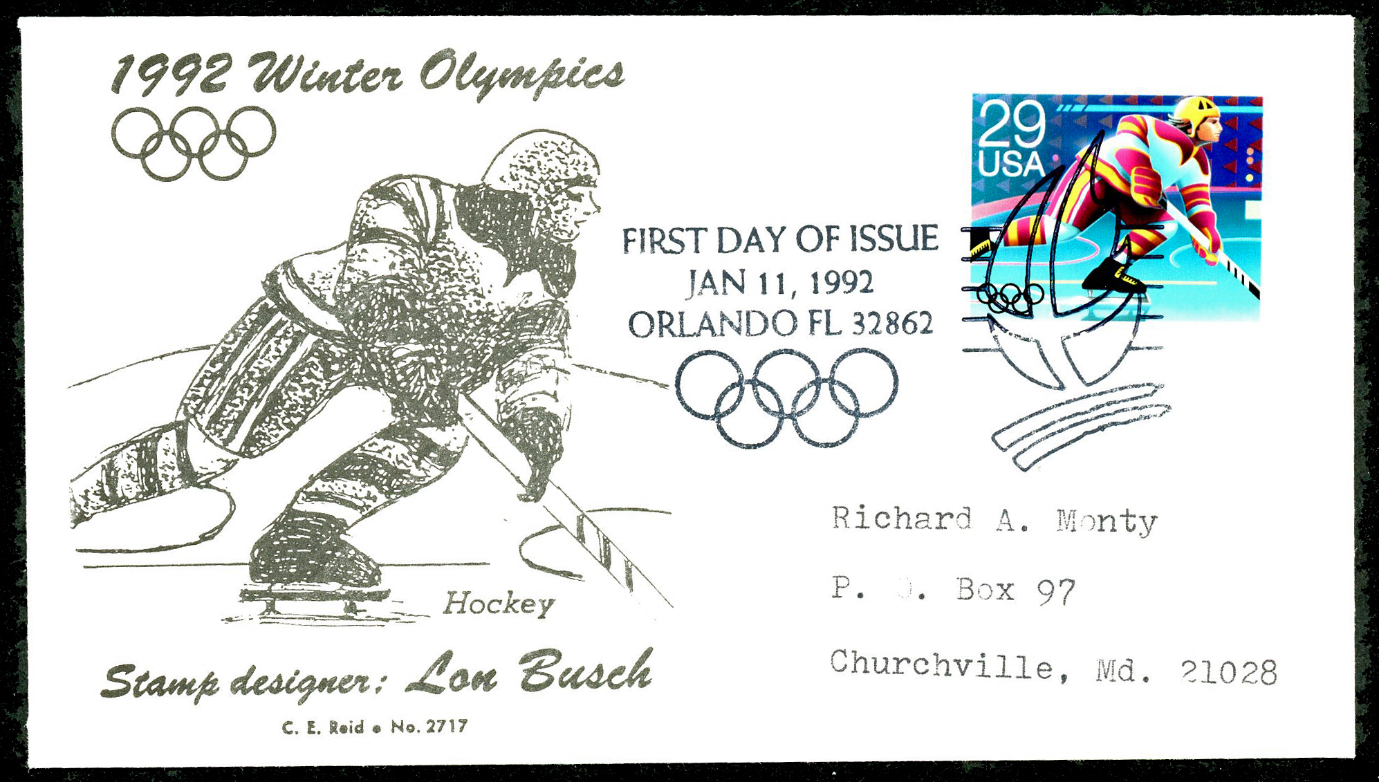 Click here for higher resolution image | First Day Cover for usa-19920111-s-001 First day of issue: January 11, 1992 Width: 165 mm Height: 92 mm Cachet maker: C.E. Reid Location: Box 1008 Idfdc = 1996 From Linn's "Stamp Issuing Entities Of The World" page. United States of America (1847-) Stamp-issuing status: active; Population: 248,709,873 (1990). Republic occupying the central portion of North America, along with Alaska, Hawaii and a large number of island possessions in the Caribbean Sea and the Pacific Ocean. |