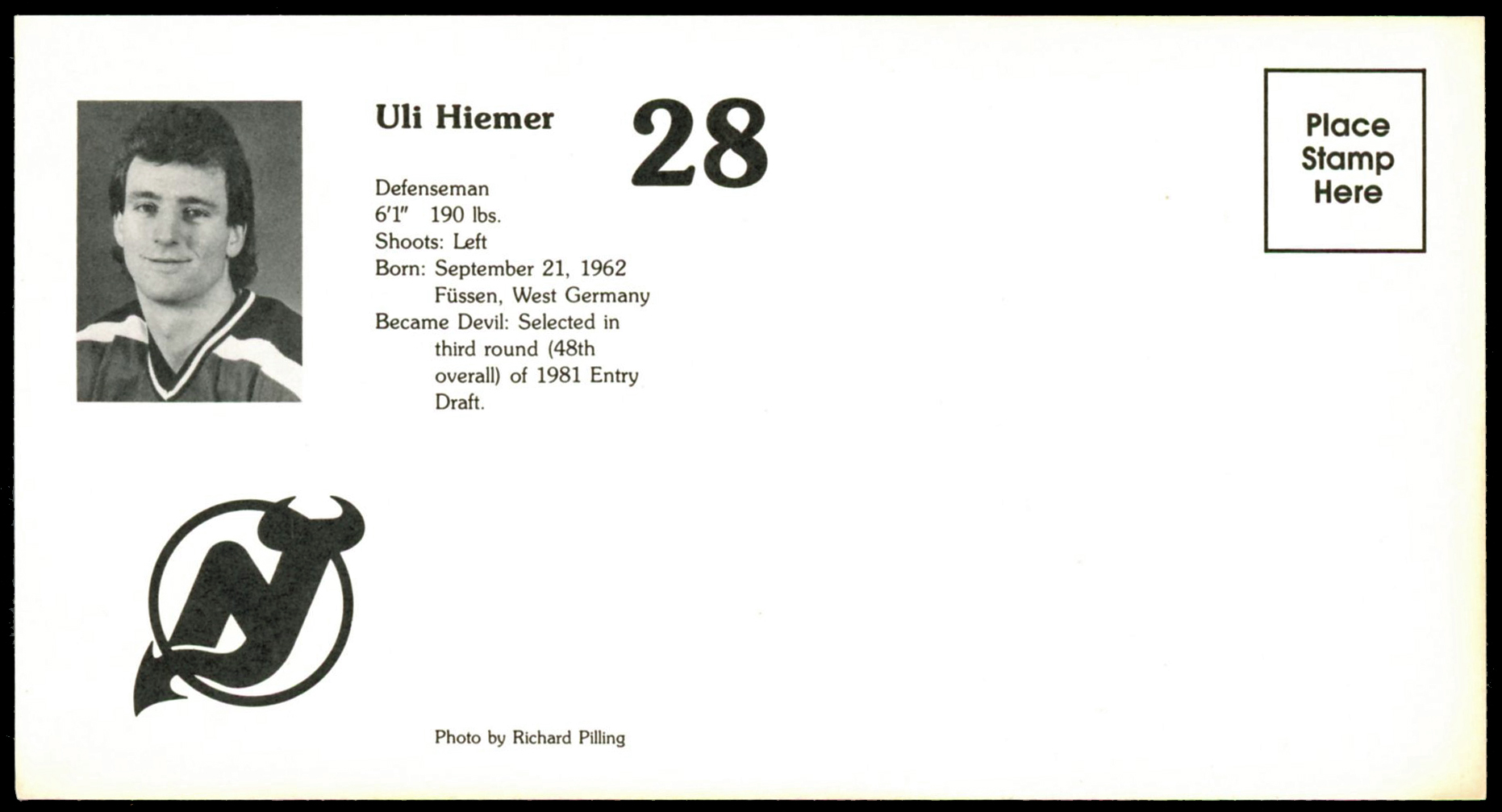 Click here for higher resolution image | First day of issue: 1984 Width: 83 mm Height: 155 mm Location: Box 1007 Stamp ID = 8790 Photograph by Richard Pilling who was the official team photographer for the New Jersey Devils from 1982 - 1986. There were 25 cards in the set but they were numbered 1 through 33, missing numbers 3,6,7,10,11,13,14,26,31 and one card was not even numbered. The cards were numbered using the player sweater numbers and the reason one card was not numbered was because the card showed the coach, Doug Carpenter. Note there is no Coca-Cola logo between the New Jersey Devils logo at the bottom of the card as there was in the 1983-84 series. Post card shows Uli Hiemer |