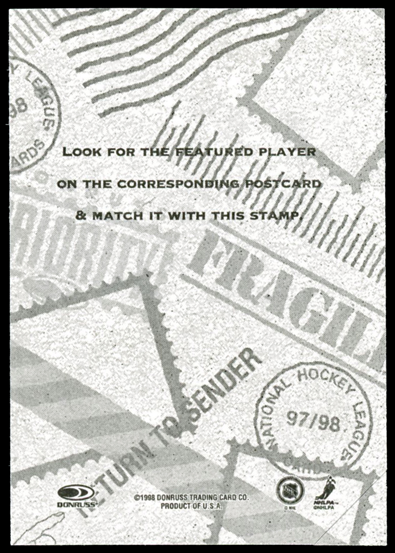 Click here for higher resolution image | First day of issue: April 01, 1998 Width: 63 mm Height: 90 mm Stamp ID = 8996 Location: Hockey card: Donruss Donruss, the hockey card company, produced the hockey card that goes along with the stamp guy-19980401-s-043. Hockey card stamp shows Peter Forsberg |