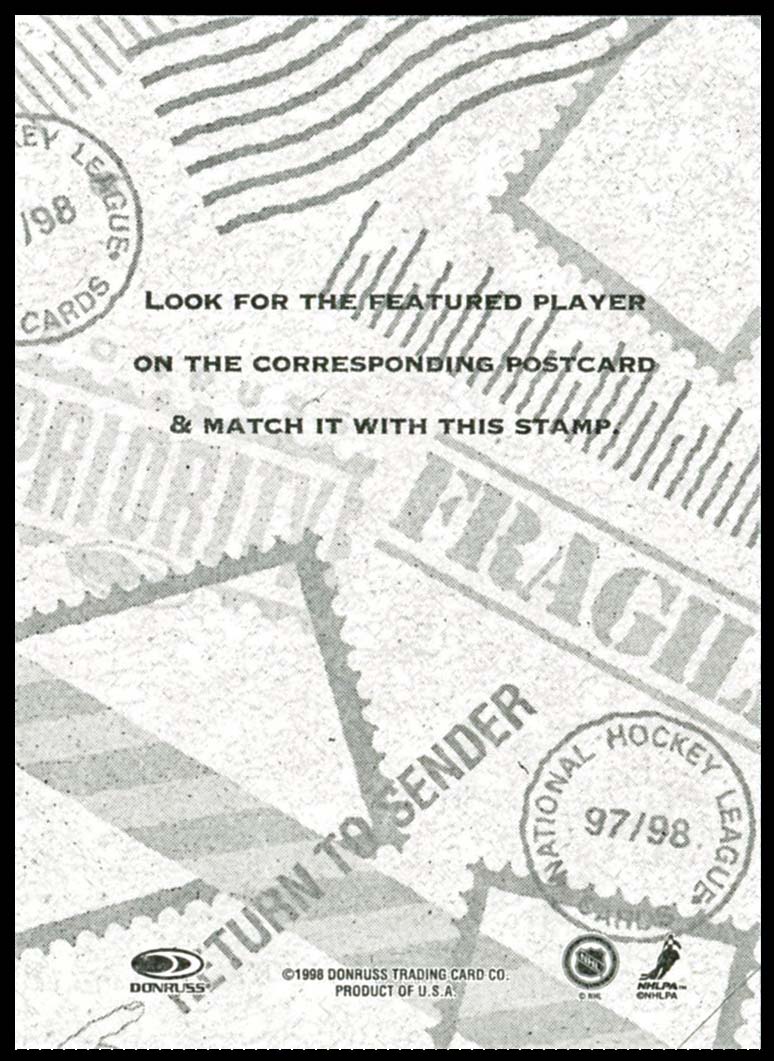 Click here for higher resolution image | First day of issue: April 01, 1998 Width: 63 mm Height: 90 mm Stamp ID = 9001 Location: Hockey card: Donruss Donruss, the hockey card company, produced the hockey card that goes along with the stamp guy-19980401-s-048. Hockey card stamp shows Jaromir Jagr |