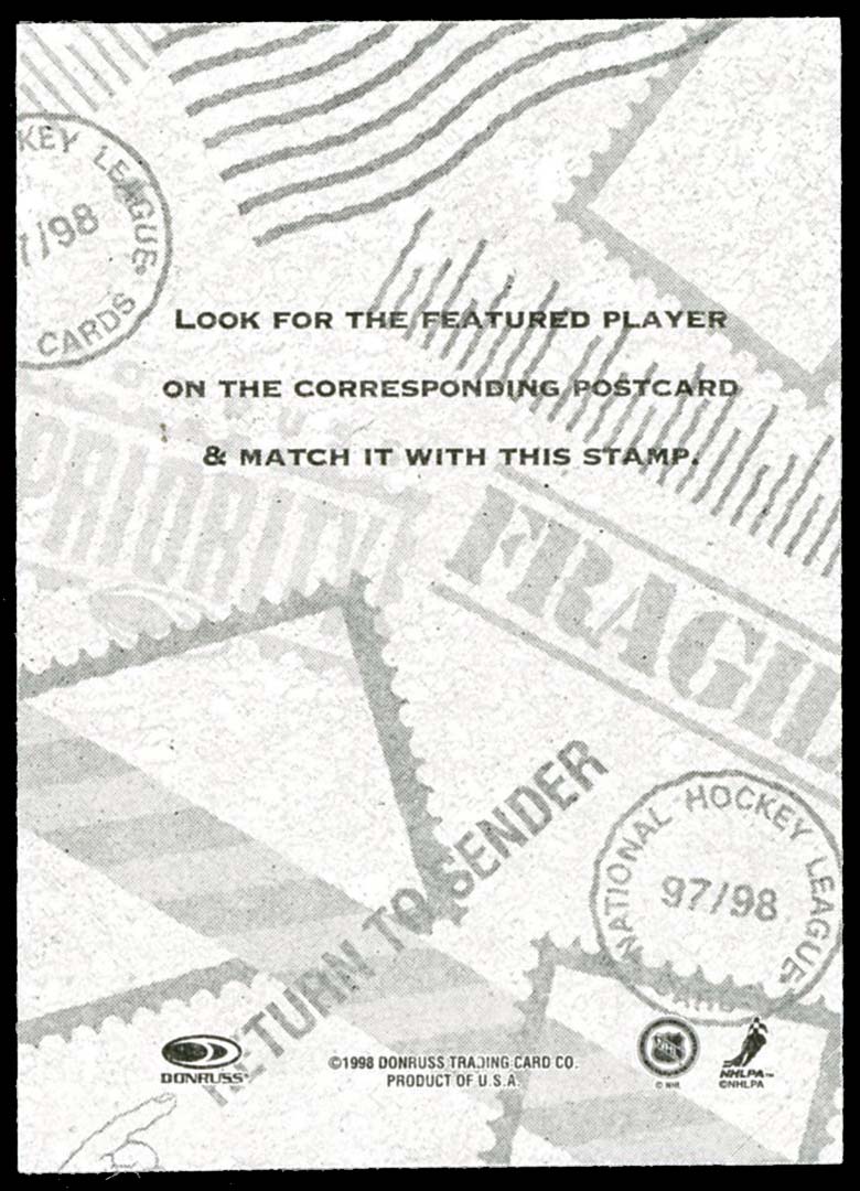 Click here for higher resolution image | First day of issue: April 01, 1998 Width: 63 mm Height: 90 mm Stamp ID = 9002 Location: Hockey card: Donruss Donruss, the hockey card company, produced the hockey card that goes along with the stamp guy-19980401-s-049. Hockey card stamp shows Paul Kariya |