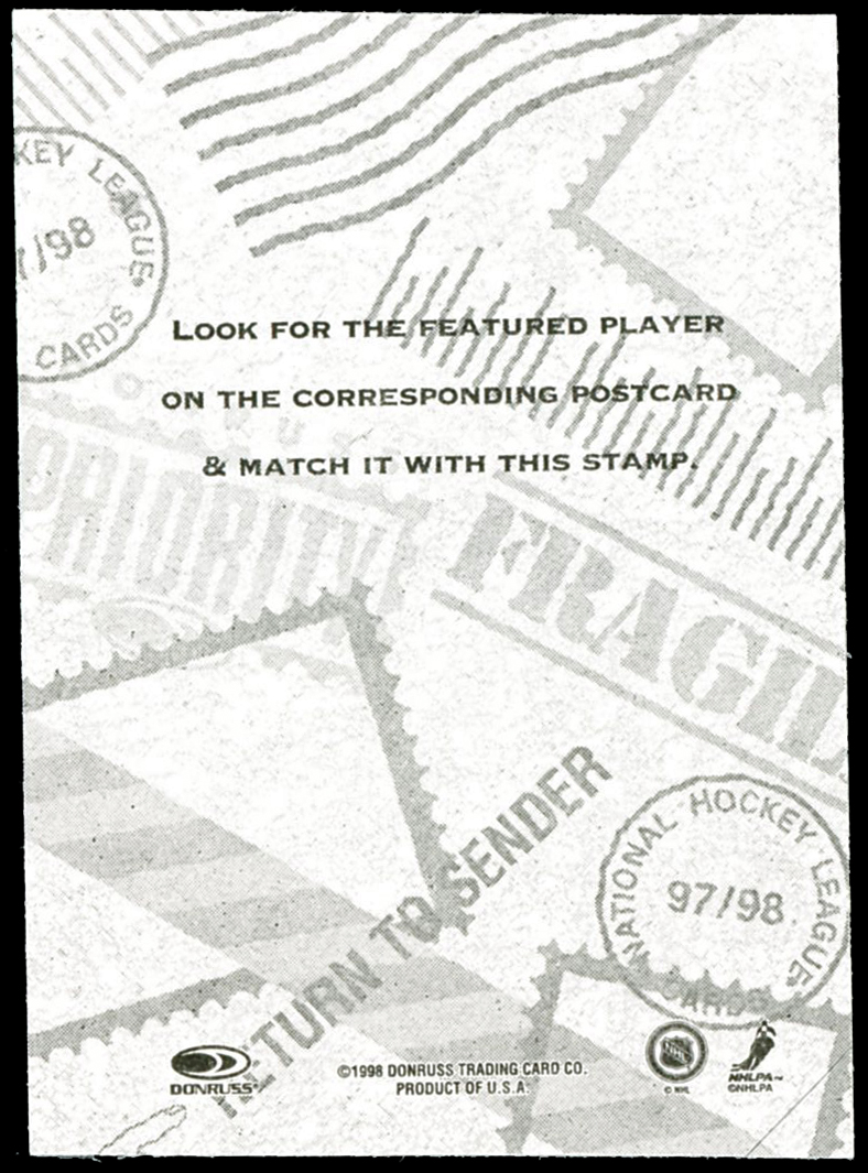 Click here for higher resolution image | First day of issue: April 01, 1998 Width: 63 mm Height: 90 mm Stamp ID = 9032 Location: Hockey card: Donruss Donruss, the hockey card company, produced the hockey card that goes along with the stamp guy-19980401-s-079. Hockey card stamp shows Peter Forsberg |