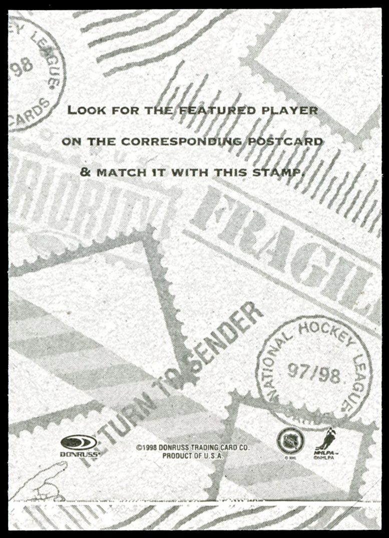 Click here for higher resolution image | First day of issue: April 01, 1998 Width: 63 mm Height: 90 mm Stamp ID = 9035 Location: Hockey card: Donruss Donruss, the hockey card company, produced the hockey card that goes along with the stamp guy-19980401-s-082. Hockey card stamp shows Brett Hull |