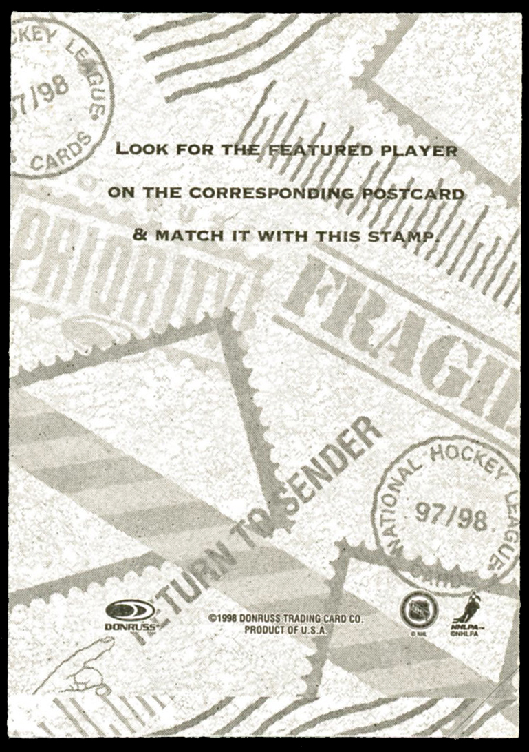 Click here for higher resolution image | First day of issue: April 01, 1998 Width: 63 mm Height: 90 mm Stamp ID = 9051 Location: Hockey card: Donruss Donruss, the hockey card company, produced the hockey card that goes along with the stamp guy-19980401-s-098. Hockey card stamp shows Joe Sakic |