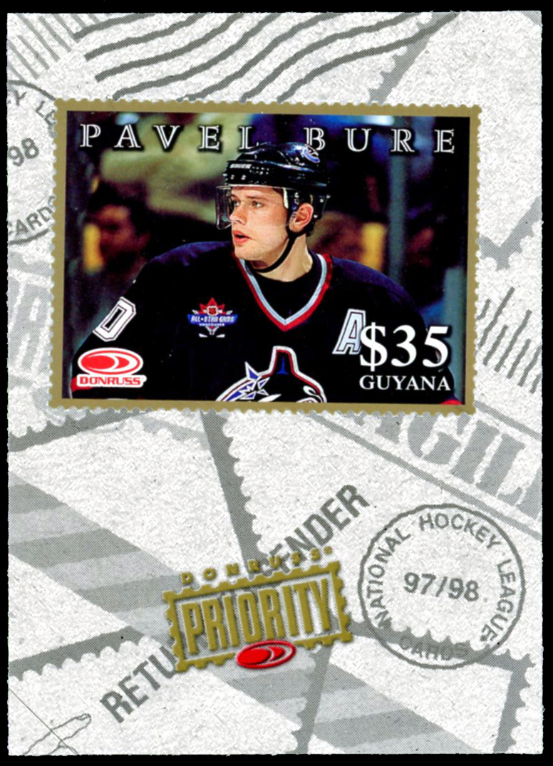Click here for higher resolution image | First day of issue: April 01, 1998 Width: 63 mm Height: 90 mm Stamp ID = 9065 Location: Hockey card: Donruss Donruss, the hockey card company, produced the hockey card that goes along with the stamp guy-19980401-s-112. Hockey card stamp shows Pavel Bure |