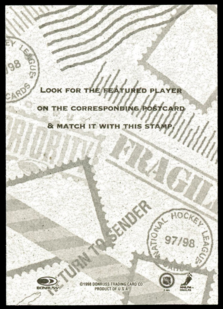 Click here for higher resolution image | First day of issue: April 01, 1998 Width: 63 mm Height: 90 mm Stamp ID = 9088 Location: Hockey card: Donruss Donruss, the hockey card company, produced the hockey card that goes along with the stamp guy-19980401-s-135. Hockey card stamp shows Sergei Samsonov |