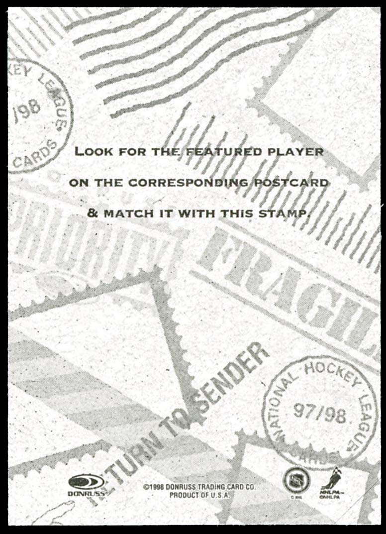 Click here for higher resolution image | First day of issue: April 01, 1998 Width: 63 mm Height: 90 mm Stamp ID = 9097 Location: Hockey card: Donruss Donruss, the hockey card company, produced the hockey card that goes along with the stamp guy-19980401-s-144. Hockey card stamp shows Dainius Zubrus |