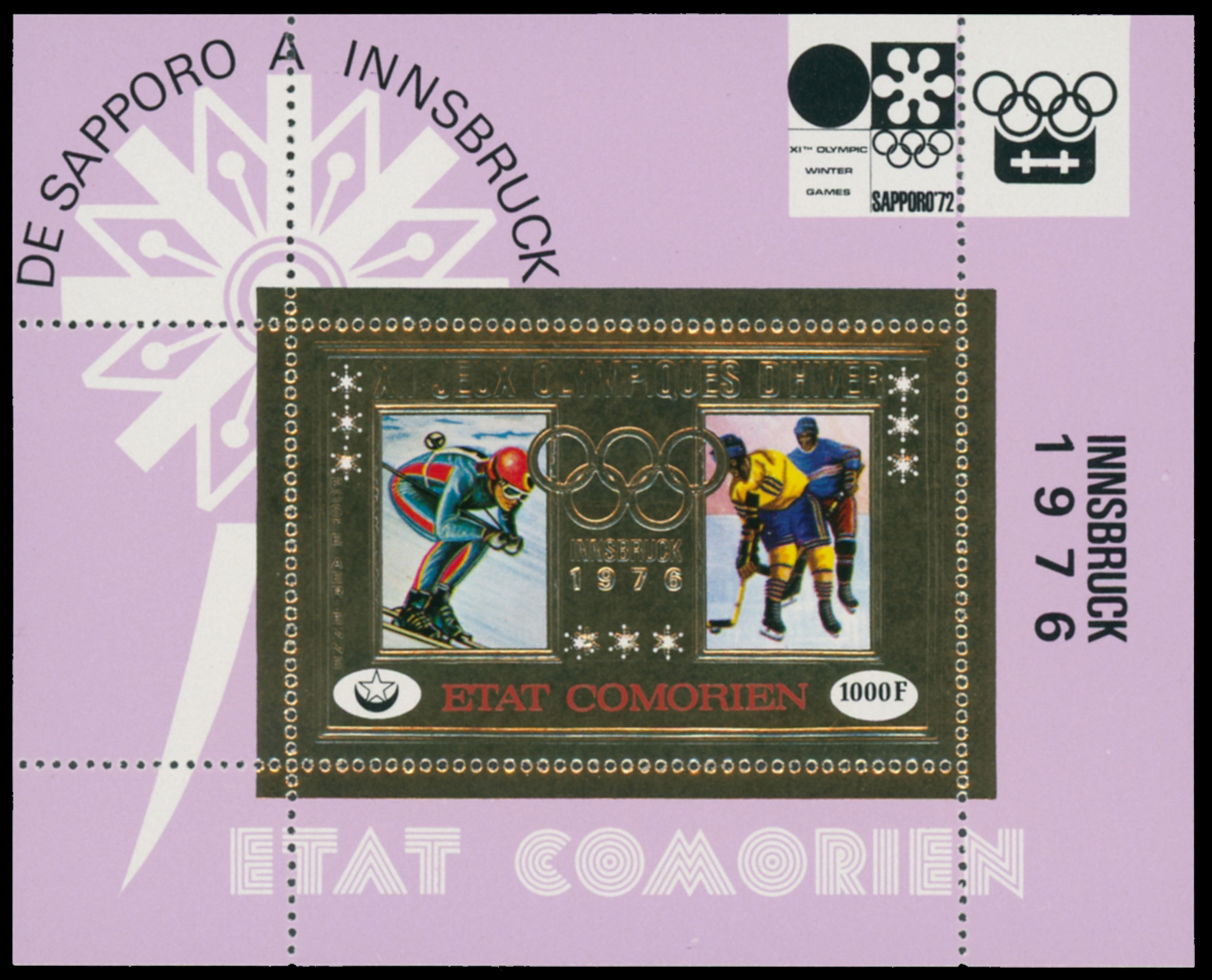 Click here for higher resolution image | First day of issue: March 30, 1976 Occasion: 1976 Winter Olympics,1976,Innsbruck,Austria Width: 106 mm Height: 85 mm Perforation: Perforated 13.50 x 13.50 Printing method: Lithographed and embossed Location: Ice Hockey Volume XL Stamp ID = 6006 From Linn's "Stamp Issuing Entities Of The World" page. Comoro Islands (1950-) Stamp-issuing status: active; Population: 589,797. A group of islands in the Mozambique Channel between Mozambique and Madagascar. |