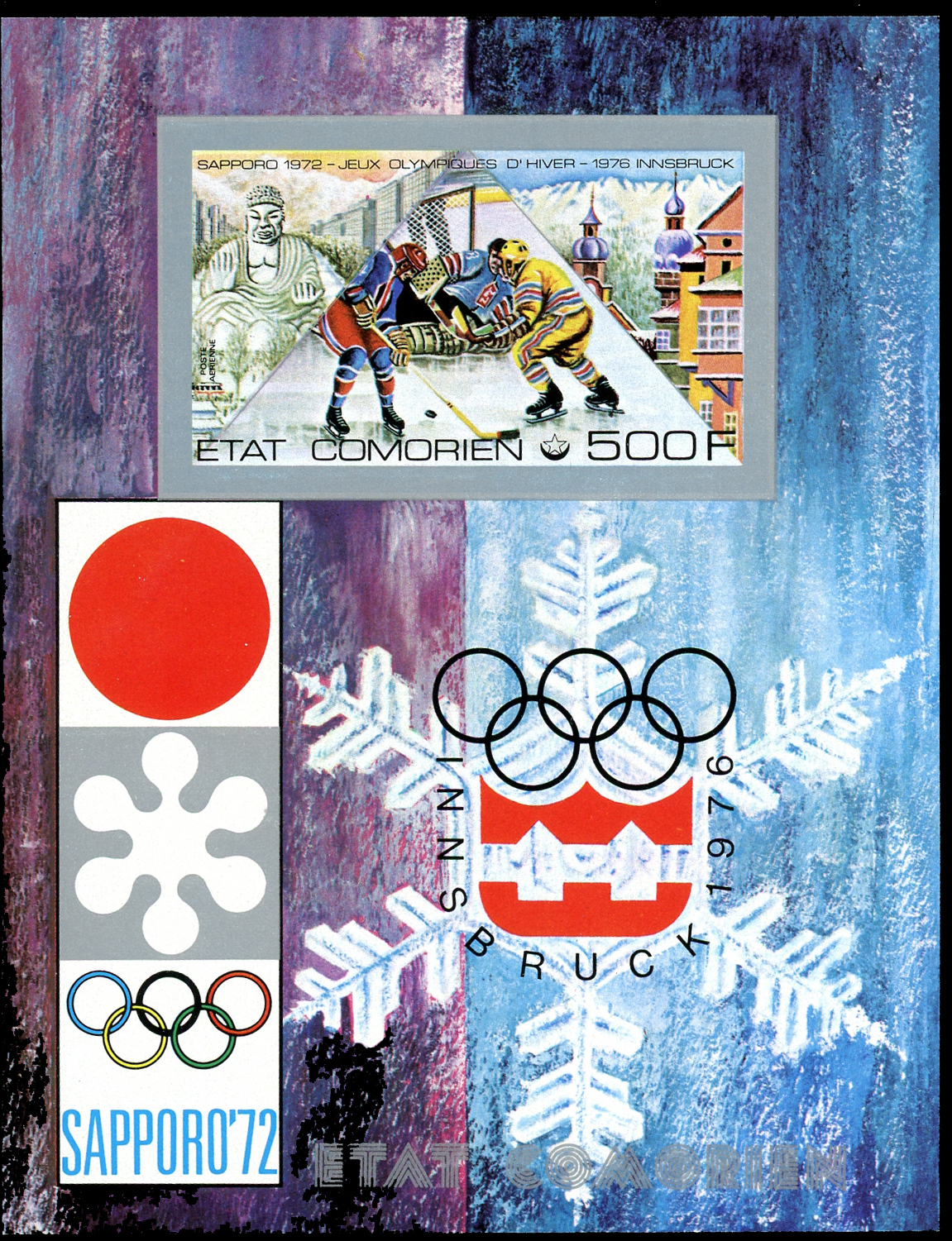 Click here for higher resolution image Click here to see FDC's | First day of issue: April 30, 1976 Width: 96 mm Height: 127 mm Perforation: Imperforate Location: Ice Hockey Volume XL Stamp ID = 2199 This stamp was issued to show the transition from the 1972 Winter Olympics is Sapporo, Japan to the 1976 Winter Olympics in Innsbruck, Austria. From Linn's "Stamp Issuing Entities Of The World" page. Comoro Islands (1950-) Stamp-issuing status: active; Population: 589,797. A group of islands in the Mozambique Channel between Mozambique and Madagascar. |