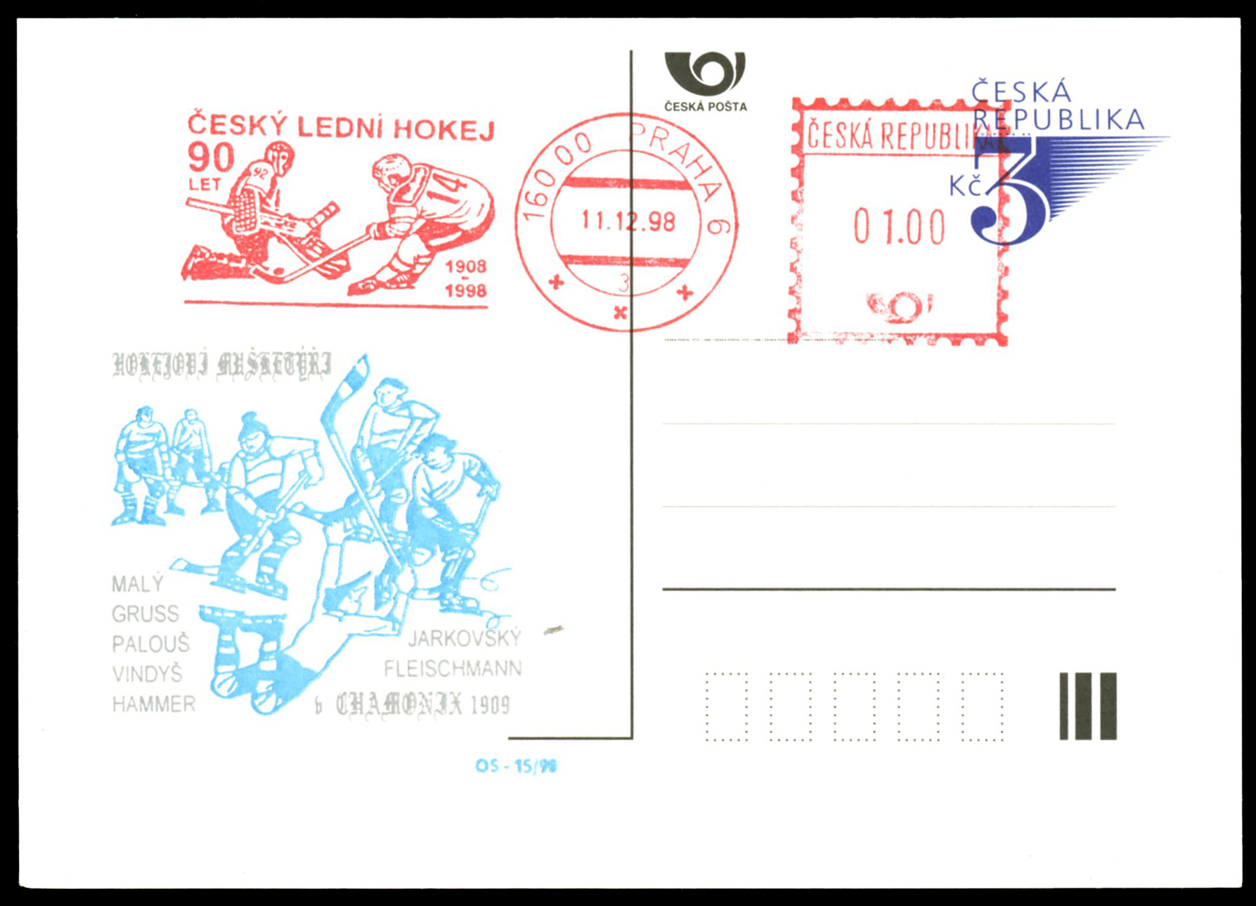Click here for higher resolution image | First day of issue: December 11, 1998 Width: 100 mm Height: 30 mm Location: Ice Hockey Volume XXXVII Stamp ID = 5577 Meter size is 100 mm x 30 mm. NOTEČESKÝ LEDNI HOKEJ 90 LET 1908 1998 translated CZECH ICE HOCKEY 90 YEARS 1908 1998 From Linn's "Stamp Issuing Entities Of The World" page. Czech Republic (1993- ) Stamp-issuing status: active; Population: 10,318,958. A republic in central Europe, comprising the Czech portion of the former Czechoslovakia, corresponding to the historic Bohemia. |