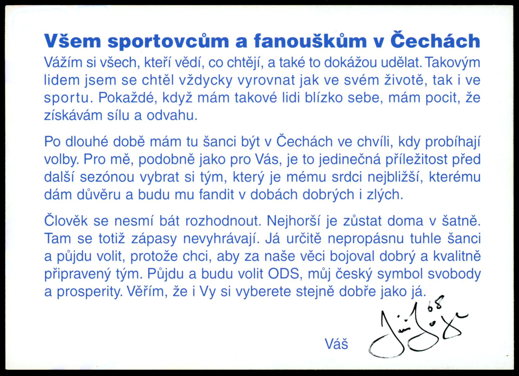 Click here for higher resolution image | First day of issue: 2004 Width: 105 mm Height: 145 mm Location: Ice Hockey Volume XXXVII Stamp ID = 5837 Post card autographed on both sides by Jaromir Jagr. Autographed by Jaromir Jagr From Linn's "Stamp Issuing Entities Of The World" page. Czech Republic (1993- ) Stamp-issuing status: active; Population: 10,318,958. A republic in central Europe, comprising the Czech portion of the former Czechoslovakia, corresponding to the historic Bohemia. |