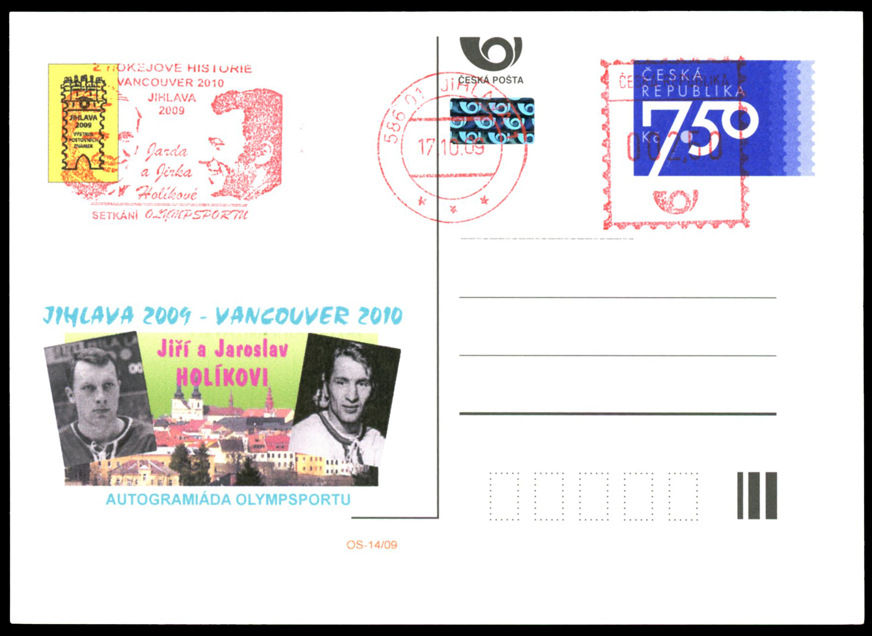 Click here for higher resolution image | First day of issue: October 17, 2009 Width: 100 mm Height: 30 mm Location: Ice Hockey Volume XXXVII Stamp ID = 5581 Jihlava is a city in the Czech Republic and was the site of the 57th meeting of Olympsport. This meter honored the Holik brothers: Jaroslav and Jiří Meter is 100 mm x 30 mm. NOTE