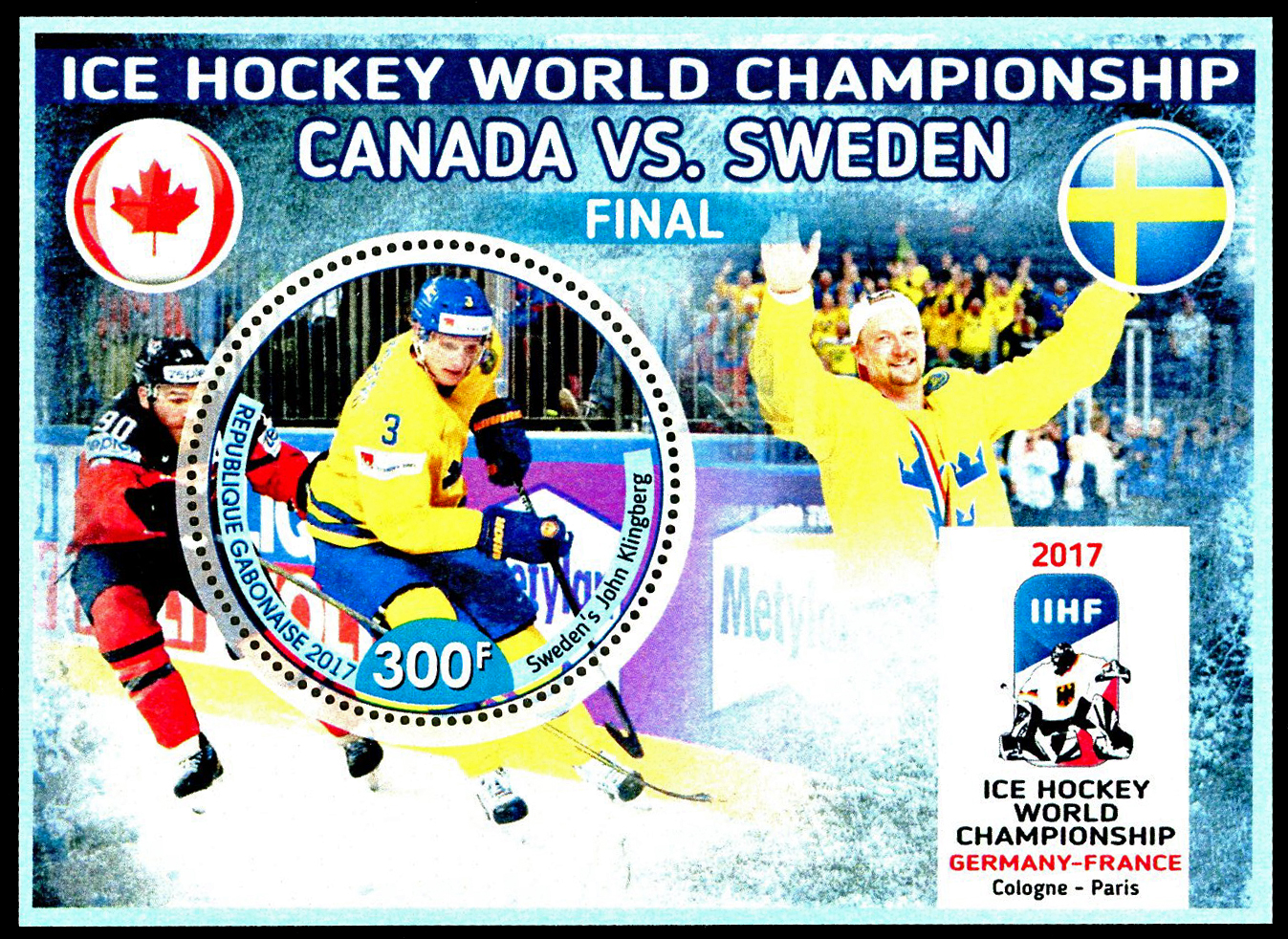 Click here for higher resolution image | First day of issue: 2017 Occasion: 2017 Men's World Ice Hockey Championships,2017,Cologne & Paris,Germany & France Width: 110 mm Height: 81 mm Location: Ice Hockey Volume LII Stamp ID = 9200 This appears to be a fantasy creation. Souvenir sheet shows John Klingberg From Linn's "Stamp Issuing Entities Of The World" page. Gabon (1886-1936, 1959-) Stamp-issuing status: active; Population: 1,190,159. Republic in western Equatorial Africa, north of the Congo region. |