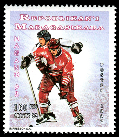 Click here for higher resolution image | First day of issue: 1997 Occasion: 1998 Winter Olympics,1998,Nagano,Japan Width: 33 mm Height: 38 mm Perforation: Perforated 13.50 x 13.50 Printing method: Lithographed Catalog number: Scott 1331 Location: Ice Hockey Volume LXV Stamp ID = 2930 From Linn's "Stamp Issuing Entities Of The World" page. Madagascar (Malagasy Republic) (1889-) Stamp-issuing status: active; Population: 10.28 million (1986 estimate). A large island in the Indian Ocean off the southeast coast of Africa. |