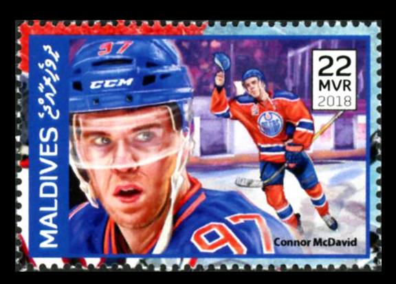 Click here for higher resolution image | First day of issue: May 10, 2018 Width: 46 mm Height: 30 mm Perforation: Perforated 13.50 x 13.25 Location: Ice Hockey Volume LXVI Stamp ID = 5598 Stamp shows Connor McDavid From Linn's "Stamp Issuing Entities Of The World" page. Maldive Islands (1906-) Stamp-issuing status: active; Population: 280,391. A group of islands in the Indian Ocean, southwest of Ceylon. |