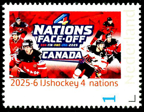Click here for higher resolution image | First day of issue: 2025 Width: 40 mm Height: 30 mm Perforation: Perforated 14.00 x 13.25 Location: Ice Hockey Volume LXIX Stamp ID = 9213 A Netherland Post Office Personal Stamp created by stamp dealer Hans Neuhaus. This stamp was issued for the 4 Nations Face-Off tournament in 2025. From Linn's "Stamp Issuing Entities Of The World" page. Netherlands (1852-) Stamp-issuing status: active; Population: 15,653,091 (1997). Constitutional monarchy in northwest Europe, bordering on the North Sea. |