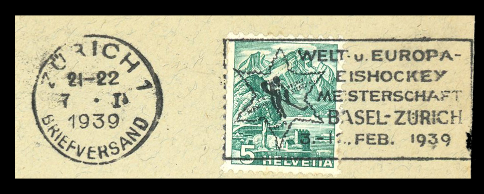 Click here for higher resolution image | Occasion: 1939 Men's World Ice Hockey Championships, 1939, Zürich and Basel, Switzerland Belongs to cancel group 35 idcancel = 803 The 1939 World Ice Hockey Championship was held in Zurich and Basel, Switzerland, from February 3 through February 12, 1939. There was one common cancel banner used and it was used in numerous cities and two Automobil-Postbureau locations. Also the use of the cancel started well before the first day of the tournament, February 3. The banner size was 42 mm x 20 mm and the bullseye was 23 mm in diameter. The Automobil-Postbureau cancels did not have the banner but they were stamped in red or blue with the location. NOTE