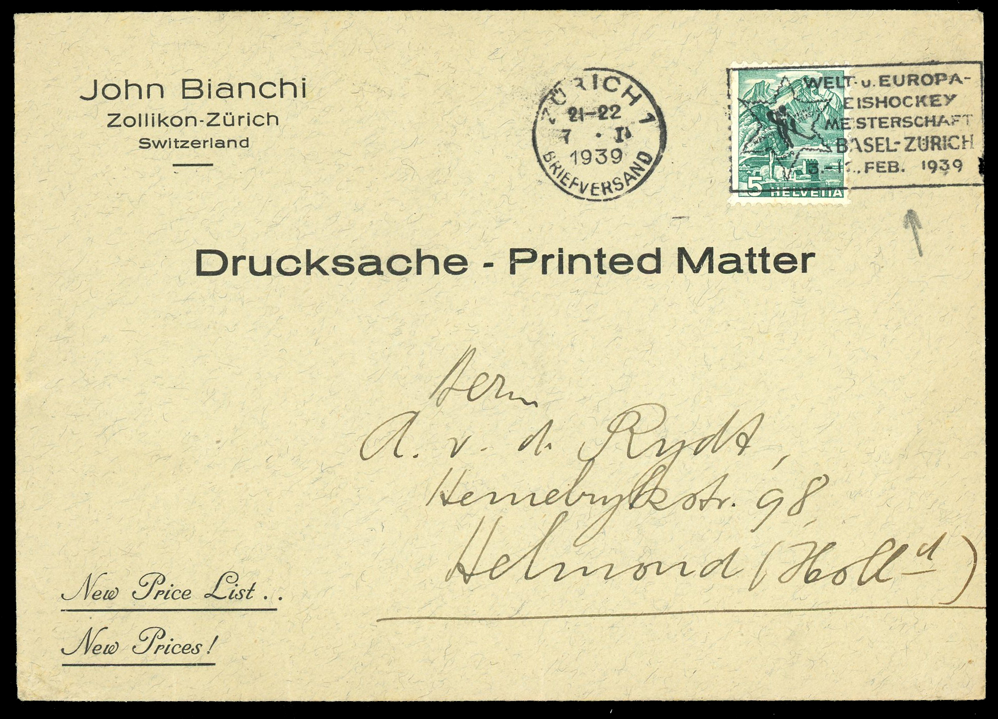 The 1939 World Ice Hockey Championship was held in Zurich and Basel, Switzerland, from February 3 through February 12, 1939. There was one common cancel banner used and it was used in numerous cities and two Automobil-Postbureau locations. Also the use of the cancel started well before the first day of the tournament, February 3. The banner size was 42 mm x 20 mm and the bullseye was 23 mm in diameter. The Automobil-Postbureau cancels did not have the banner but they were stamped in red or blue with the location.