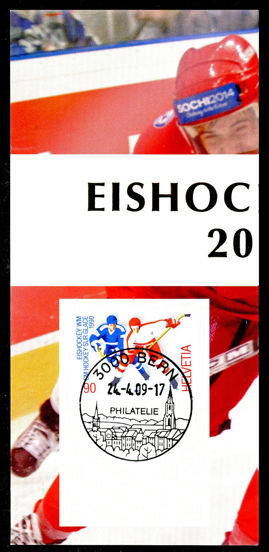 Click here for higher resolution image | First day of issue: April 24, 2009 Occasion: 2009 Men's World Ice Hockey Championships, 2009, , Switzerland Width: 141 mm Height: 148 mm Quantity printed: 700 Location: Ice Hockey Volume LXXXIX Stamp ID = 9206 4 page brochure issued with the release of swi-20090305-s-001. The first 2 pages are half width. The brochure also contains a copy of swi-19900306-s-001, the stamp for the previous IIHF tournament held in Switzerland in 1990. The 2 stamps are date stamped with the opening day of the tournament: April 24, 2009. From Linn's "Stamp Issuing Entities Of The World" page. Switzerland (1850-) Stamp-issuing status: active; Population: 7,248,984 (1997 estimate). A land-locked federation in central Europe, situated between France, Germany, Austria and Italy. The country has three official languages: German, French and Italian.In addition from Wikepedia |