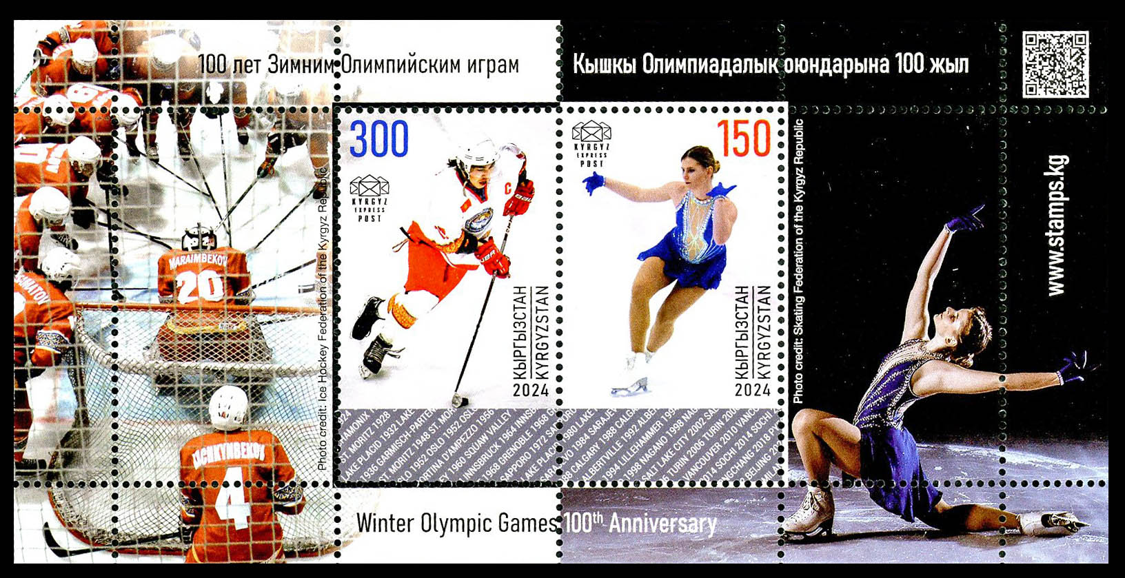 Click here for higher resolution image Click here to see FDC's | First day of issue: June 27, 2025 Width: 135 mm Height: 67 mm Perforation: Perforated 14.50 x 14.00 Printing method: Offset lithography Printer: Nova Imprim, Chisinau, Moldova Quantity printed: 1,750 Creative team: Daria Maier, Designer Location: Ice Hockey Volume LXIII Stamp ID = 9219 Stamp was issued to celebrate the 100 year anniversary of the Winter Olympics. Collective sheet shows Ersultan Mirbekov From Linn's "Stamp Issuing Entities Of The World" page. Kyrgyzstan (1992-) Stamp-issuing status: active. Population: 3,858,736. Republic in central Asia, situated between Kazakstan, Uzbekistan, Tajikistan and China. |