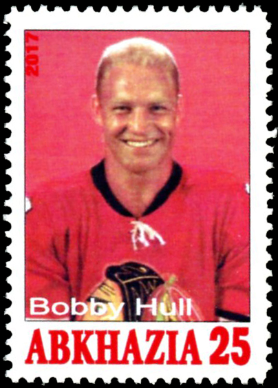 Click here for higher resolution image | First day of issue: 2017 Width: 33 mm Height: 46 mm Perforation: Perforated 10.50 x 10.50 Location: Ice Hockey Volume I Stamp ID = 5446 Local post shows Bobby Hull From Linn's "Stamp Issuing Entities Of The World" page. Abkhazia (1995-) Stamp-issuing status: active; Population: 537,000 (1989). An autonomous region of the republic of Georgia, located on the Black Sea. Since 1995, many pictorial sets and souvenir sheets, offered as local issues, have appeared on the market. These are bogus, issued by private individuals for sale to collectors. |