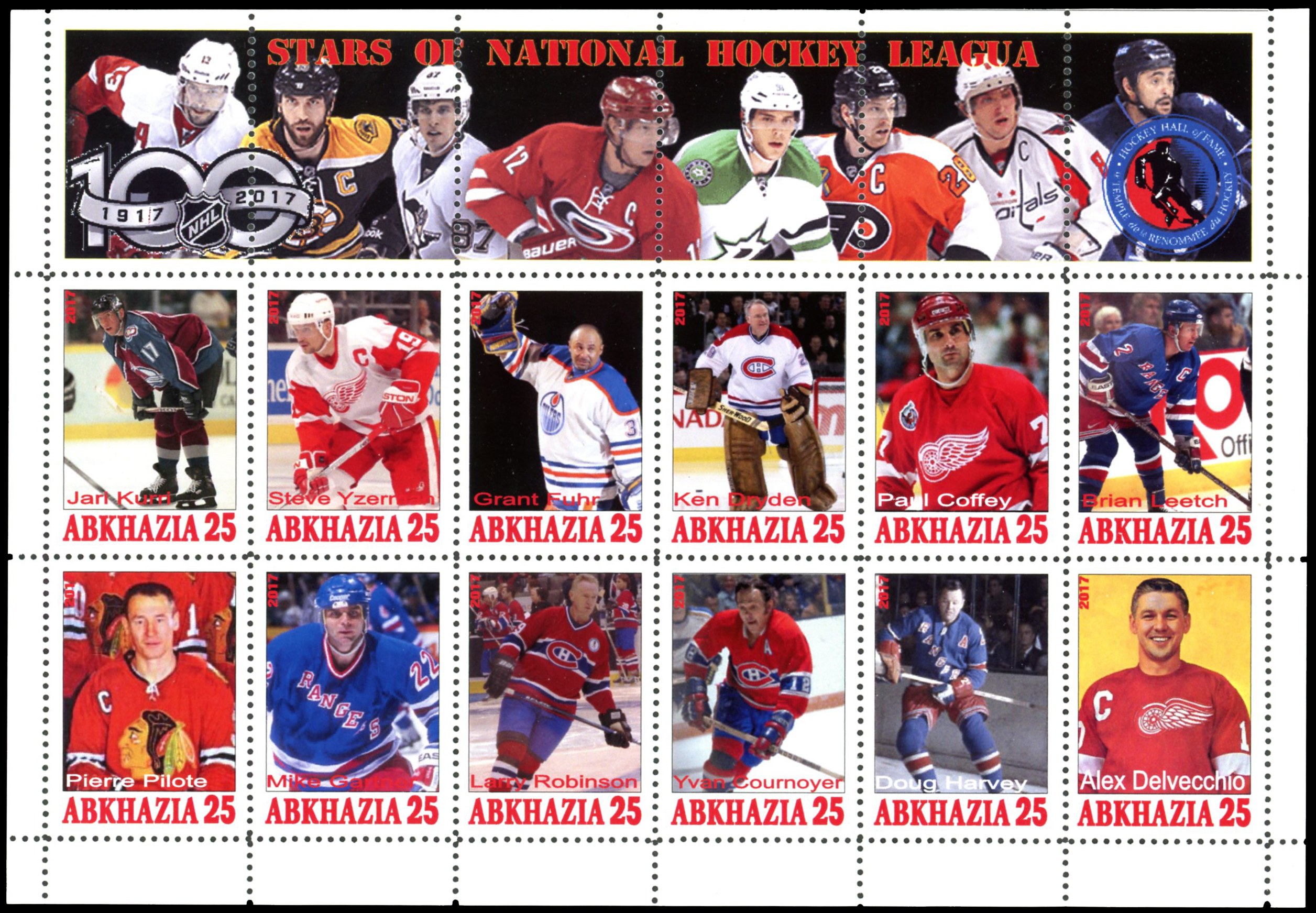 Issue date: 2017 Width: 210 mm Height: 147 mm Location: Oversize album #1 Appearing in the top border, left to right, we see Oliver Ekman-Larsson Zdeno Chara Sidney Crosby Eric Staal Jamie Benn Claude Giroux Alexander Ovechkin Dustin Byfuglien From Linn's "Stamp Issuing Entities Of The World" page. Abkhazia (1995-) Stamp-issuing status: active; Population: 537,000 (1989). An autonomous region of the republic of Georgia, located on the Black Sea. Since 1995, many pictorial sets and souvenir sheets, offered as local issues, have appeared on the market. These are bogus, issued by private individuals for sale to collectors. | ||||||||||||||||||||||||||||