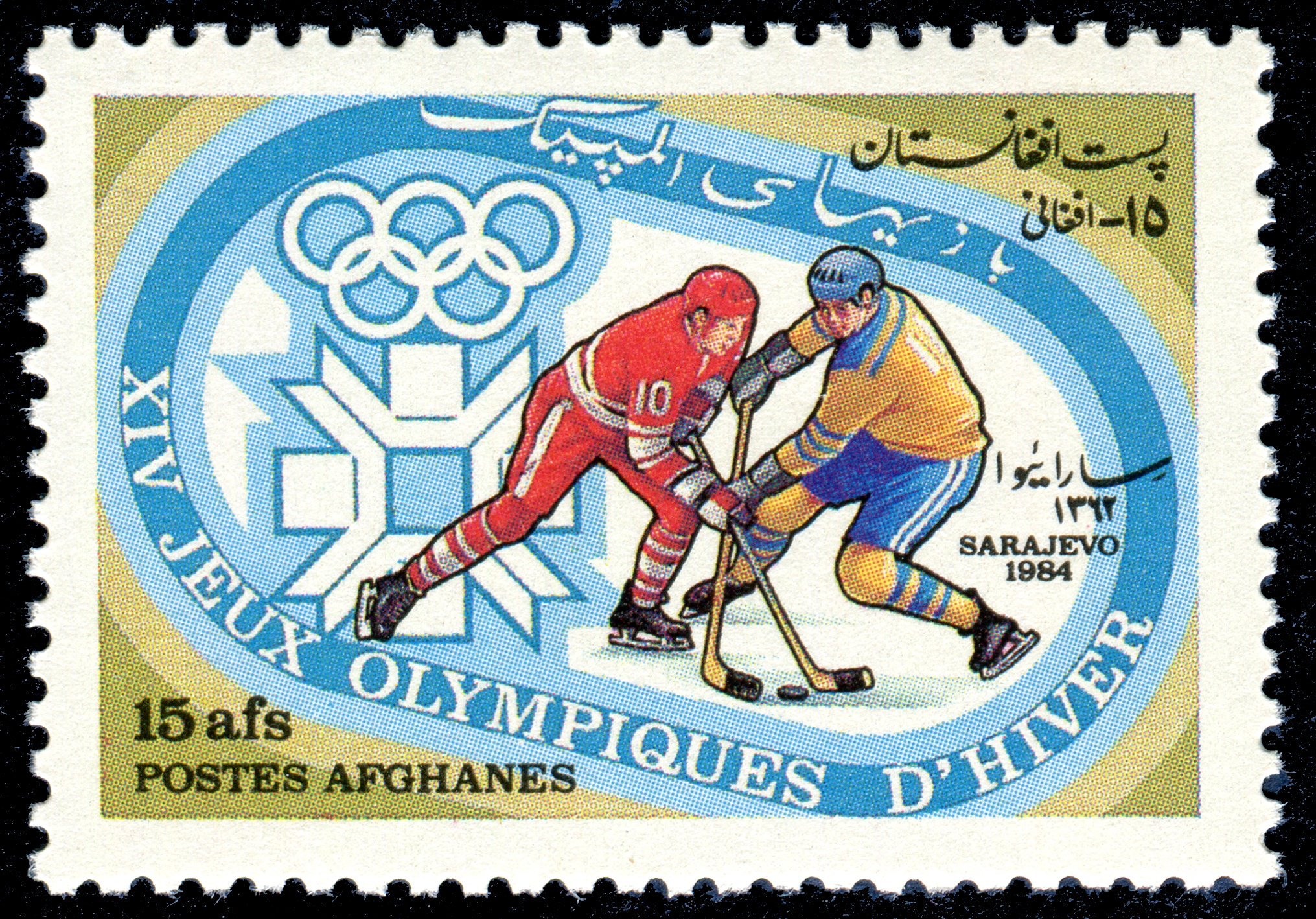 Click here for higher resolution image | First day of issue: January, 1984 Occasion: 1984 Winter Olympics,1984,Sarejevo,Yugoslavia Width: 35 mm Height: 24 mm Perforation: Perforated 12.00 x 12.00 Catalog number: Scott 1056 Location: Ice Hockey Volume I Stamp ID = 13 From Linn's "Stamp Issuing Entities Of The World" page. Afghanistan (1871-) . . . Although Afghanistan began issuing postage stamps in 1871, it did not join the Universal Postal Union until 1928. Until then, Afghani stamps were valid only within the country and required British Indian stamps to be carried abroad. |