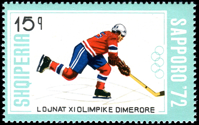 Click here for higher resolution image | First day of issue: February 10, 1972 Occasion: 1972 Winter Olympics,1972,Sapporo,Japan Width: 52 mm Height: 30 mm Perforation: Perforated 12.00 x 12.00 Printing method: Offset Creative team: S. Toptani Catalog number: Michel 1529 Scott 1405 Location: Ice Hockey Volume II Stamp ID = 55 From Linn's "Stamp Issuing Entities Of The World" page. Albania (1913-) Stamp-issuing status: active; Population: 3,249,136 (1996). A republic in southeast Europe, bordering on the Adriatic Sea. . . . |
