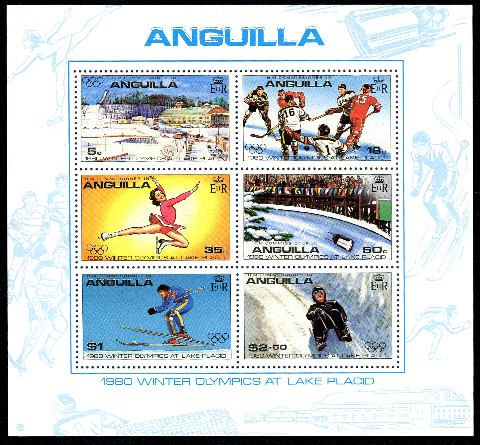 Click here for higher resolution image Click here to see FDC's | First day of issue: January 14, 1980 Occasion: 1980 Winter Olympics,1980,Lake Placid,United States Width: 136 mm Height: 128 mm Perforation: Perforated 13.00 x 13.00 Printing method: Lithographed Printer: Format International Security Printers, Ltd., London, England Creative team: John Lister Ltd. Catalog number: Scott 380a Stanley Gibbons M395 Location: Ice Hockey Volume II Stamp ID = 74 Ice hockey is also on the left hand side of the border design. From Linn's "Stamp Issuing Entities Of The World" page. Anguilla (1967-) Stamp-issuing status: active; Population: 10,424 (1996). A small island in the Caribbean, formerly attached to St. Kitts-Nevis-Anguilla. In September 1967, Anguilla declared its independence from both that state and Great Britain. In 1971 direct British control was re-established. |
