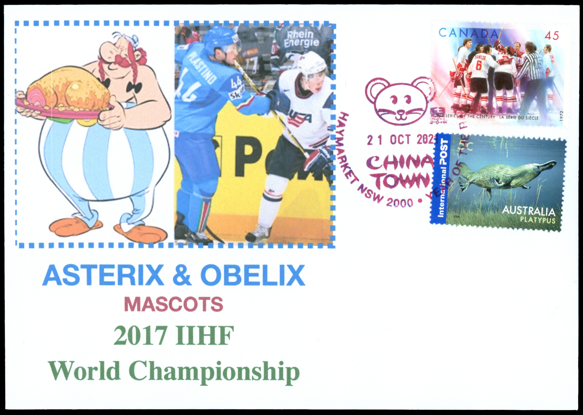 Click here for higher resolution image | First day of issue: October 21, 2021 Occasion: 2017 Men's World Ice Hockey Championships,2017,Cologne & Paris,Germany & France Width: 161 mm Height: 113 mm Location: Ice Hockey Volume II Stamp ID = 7190 Fan made cachet featuring the French comic strip characters Asterix and Obelix who were also the mascots for the 2017 tournament. The cover also contains a non-Australian hockey stamp can-19970920-s-002 from Canada. From Linn's "Stamp Issuing Entities Of The World" page. Australia (1902-) An island continent between the Pacific and Indian oceans, southeast of Asia. British settlement began in the late 18th century, with six colonies developing - New South Wales, Victoria, Queensland, South Australia, Western Australia and Tasmania. Each of these states initially issued its own stamps. These colonies united to form the Commonwealth of Australia on Jan. 1, 1901, although each continued to issue its own stamps for a number of years. |
