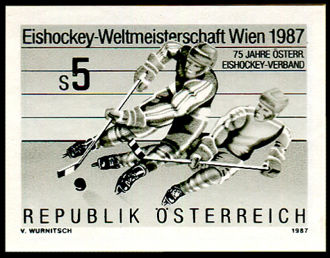 Click here for higher resolution image | First day of issue: April 17, 1987 Occasion: 1987 Men's World Ice Hockey Championships,1987,,Austria Width: 34 mm Height: 25 mm Location: Ice Hockey Volume IV Stamp ID = 92 Black print of aus-19870417-s-001. From Linn's "Stamp Issuing Entities Of The World" page. Austria (1850-) Stamp-issuing status: active; Population: 8,047,000 (1997). |
