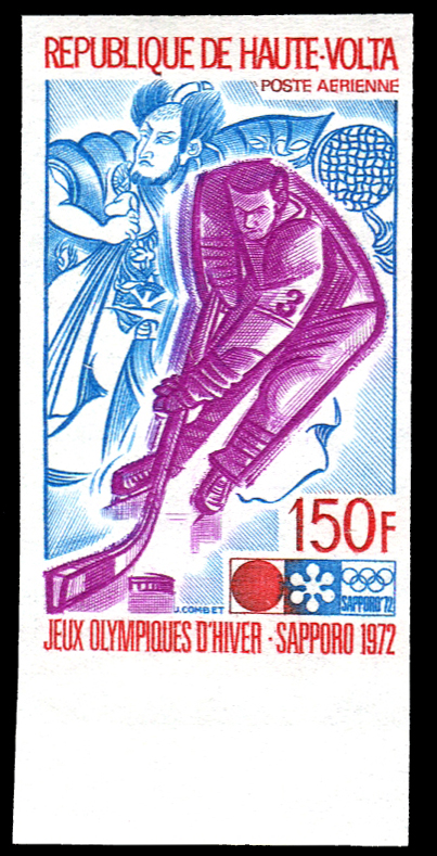 Click here for higher resolution image | First day of issue: February 15, 1972 Occasion: 1972 Winter Olympics,1972,Sapporo,Japan Width: 27 mm Height: 48 mm Perforation: Imperforate Printing method: Engraved Location: Ice Hockey Volume VI Stamp ID = 152 From Linn's "Stamp Issuing Entities Of The World" page. Burkina Faso (1984-) Stamp-issuing status: active; Population: 10,891,159. A poor, landlocked republic in the Savannah region of West Africa, formerly the French colony of Upper Volta, bounded by the states of Mali, Niger, Benin, Togo, Ghana and Ivory Coast. Following a 1983 coup d'etat, Upper Volta's name was changed to Burkina Faso on Aug. 4, 1984. The name is a transliteration of indigenous words meaning "country of incorruptible men." The first stamps bearing the new name were in an airmail set issued on May 23, 1984. |