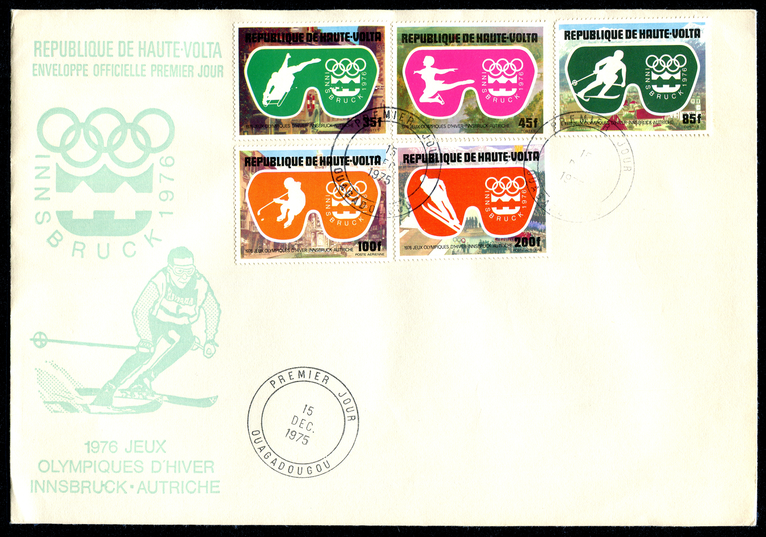 Click here for higher resolution image | First Day Cover for bur-19751215-s-001 First day of issue: December 15, 1975 Width: 242 mm Height: 165 mm Cachet maker: Unknown Location: Oversize album #1 Idfdc = 58 From Linn's "Stamp Issuing Entities Of The World" page. Burkina Faso (1984-) Stamp-issuing status: active; Population: 10,891,159. A poor, landlocked republic in the Savannah region of West Africa, formerly the French colony of Upper Volta, bounded by the states of Mali, Niger, Benin, Togo, Ghana and Ivory Coast. Following a 1983 coup d'etat, Upper Volta's name was changed to Burkina Faso on Aug. 4, 1984. The name is a transliteration of indigenous words meaning "country of incorruptible men." The first stamps bearing the new name were in an airmail set issued on May 23, 1984. |