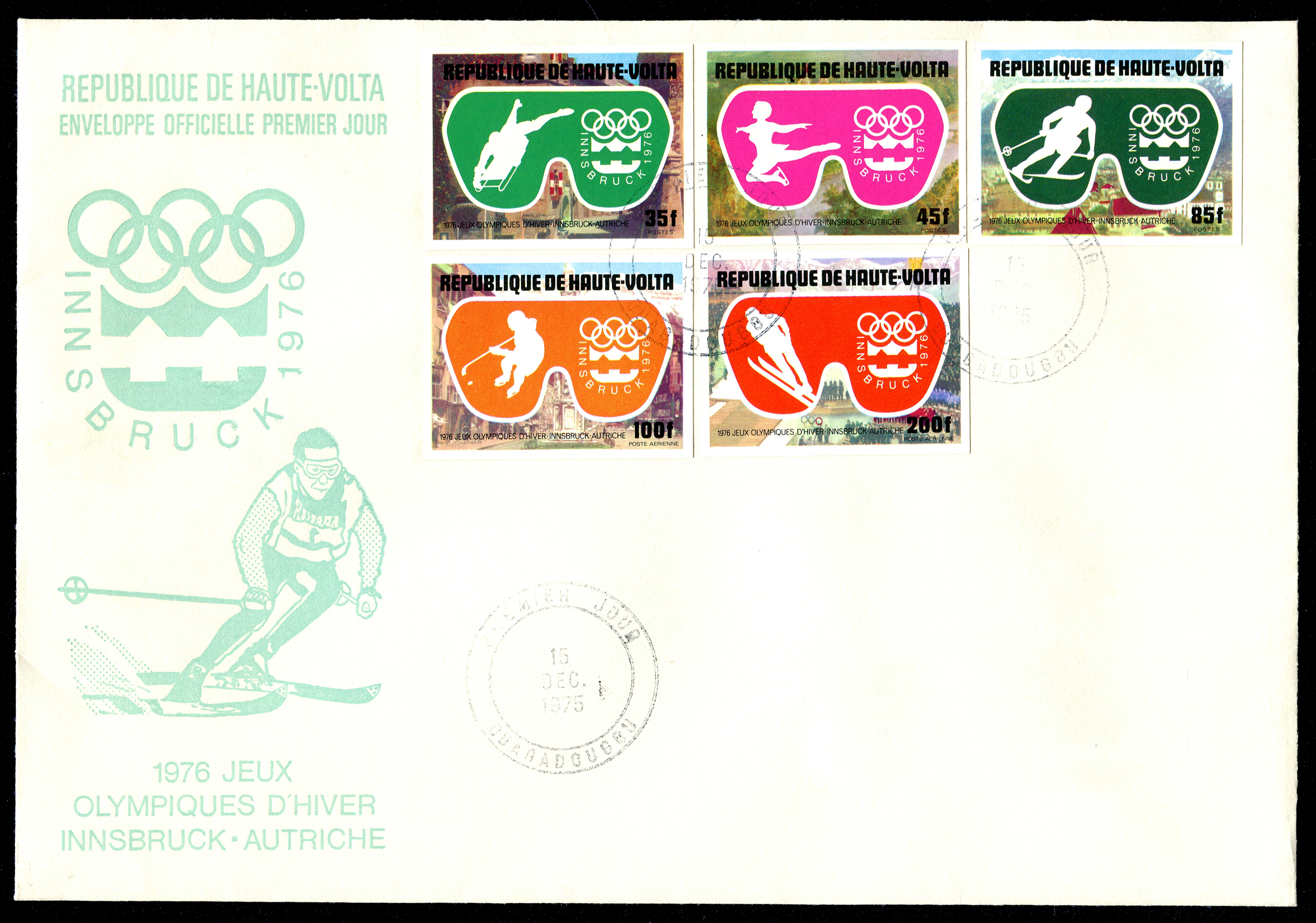 Click here for higher resolution image | First Day Cover for bur-19751215-s-002 First day of issue: December 15, 1975 Width: 242 mm Height: 165 mm Cachet maker: Unknown Location: Oversize album #1 Idfdc = 59 From Linn's "Stamp Issuing Entities Of The World" page. Burkina Faso (1984-) Stamp-issuing status: active; Population: 10,891,159. A poor, landlocked republic in the Savannah region of West Africa, formerly the French colony of Upper Volta, bounded by the states of Mali, Niger, Benin, Togo, Ghana and Ivory Coast. Following a 1983 coup d'etat, Upper Volta's name was changed to Burkina Faso on Aug. 4, 1984. The name is a transliteration of indigenous words meaning "country of incorruptible men." The first stamps bearing the new name were in an airmail set issued on May 23, 1984. |