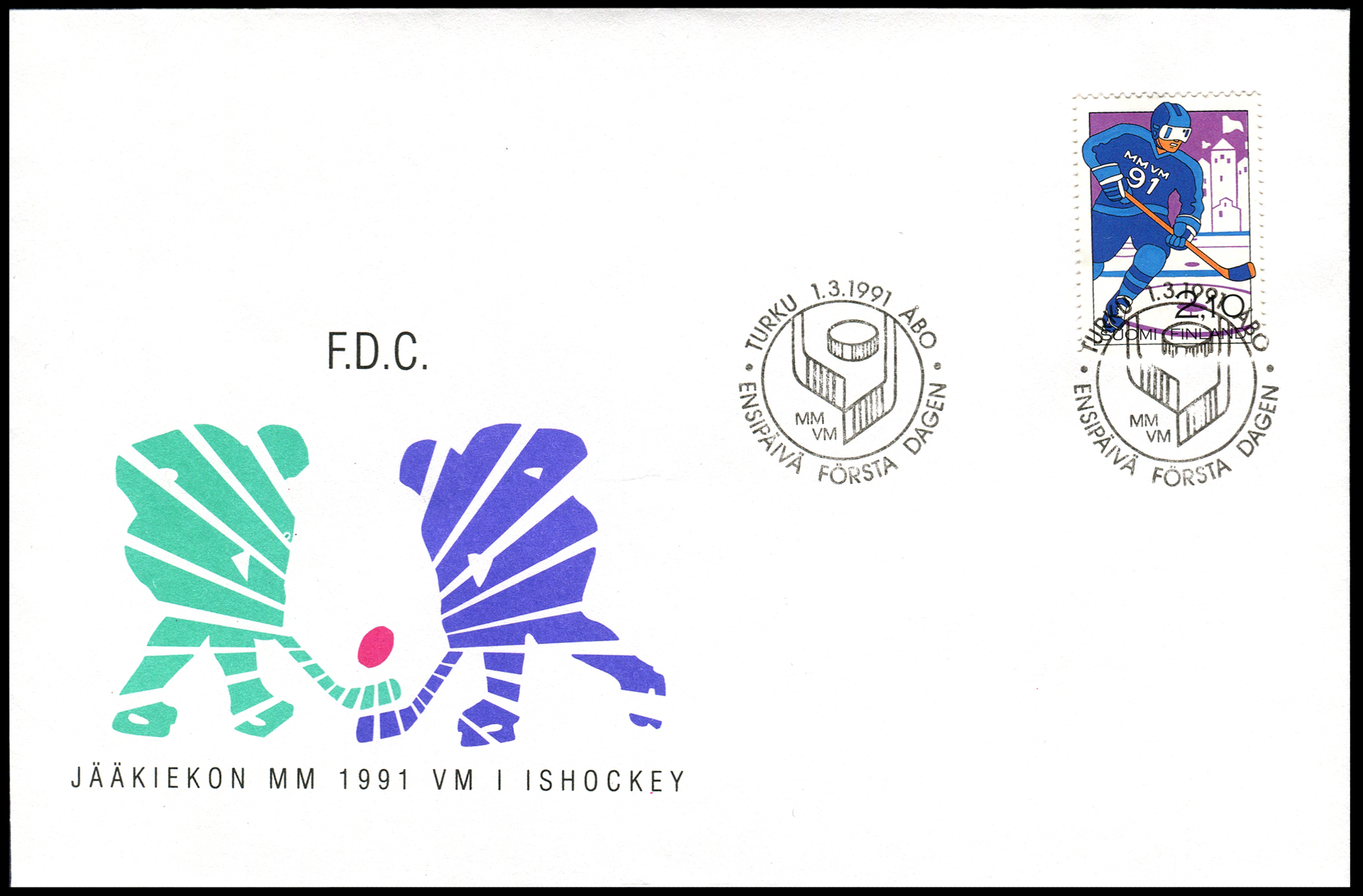 Click here for higher resolution image | First Day Cover for fin-19910301-s-001 First day of issue: March 01, 1991 Width: 175 mm Height: 115 mm Cachet maker: Unknown Location: Ice Hockey Volume L Idfdc = 309 From Linn's "Stamp Issuing Entities Of The World" page. Finland (1856-) Stamp-issuing status: active; Population: 5,109,148. A republic in northern Europe. |