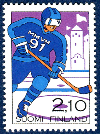 Click here for higher resolution image Click here to see FDC's | First day of issue: March 01, 1991 Occasion: 1991 Men's World Ice Hockey Championships,1991,,Finland Width: 21 mm Height: 31 mm Perforation: Perforated 14.00 x 14.00 Catalog number: Scott 846 Location: Ice Hockey Volume L Stamp ID = 2412 From Linn's "Stamp Issuing Entities Of The World" page. Finland (1856-) Stamp-issuing status: active; Population: 5,109,148. A republic in northern Europe. |