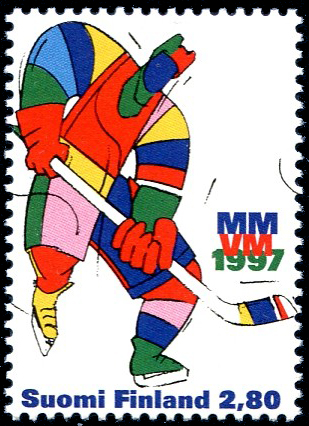 Click here for higher resolution image Click here to see FDC's | First day of issue: January 30, 1997 Occasion: 1997 Men's World Ice Hockey Championships,1997,,Finland Width: 24 mm Height: 34 mm Perforation: Perforated 14.00 x 14.00 Printing method: Offset Printer: Setec Oy, Helsinki, Finland Creative team: Pekka Liori, Designer Catalog number: Scott 1038 Location: Ice Hockey Volume L Stamp ID = 2415 From Linn's "Stamp Issuing Entities Of The World" page. Finland (1856-) Stamp-issuing status: active; Population: 5,109,148. A republic in northern Europe. |