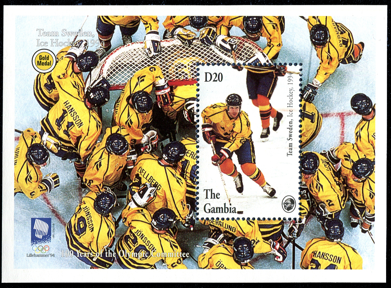 Click here for higher resolution image Click here to see FDC's | First day of issue: August 16, 1994 Width: 106 mm Height: 76 mm Perforation: Perforated 14.00 x 14.00 Catalog number: Scott 1566 Location: Ice Hockey Volume LII Stamp ID = 2467 Stamp issued for the International Olympics Committee Centenial. Stamps shows the 1994 gold medal winner in the 1994 Winter Olympics, Sweden. From Linn's "Stamp Issuing Entities Of The World" page. Gambia (1869-) Stamp-issuing status: active; Population: 1,248,085. Republic in West Africa. |