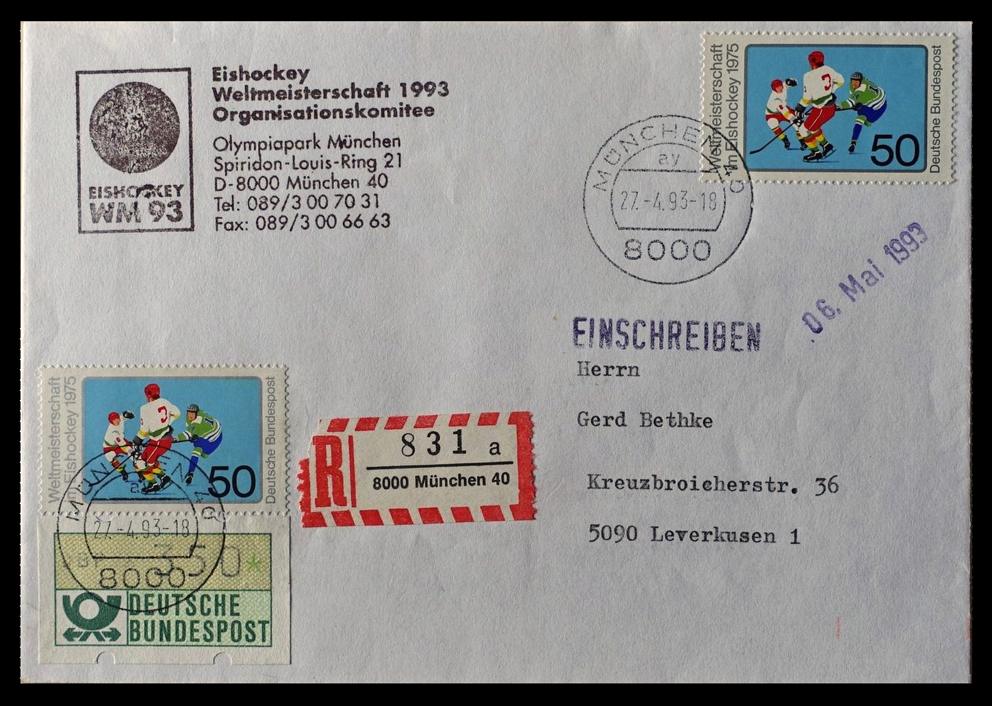 Click here for higher resolution image | First day of issue: 1993 Occasion: 1993 Men's World Ice Hockey Championships,1993,,Germany Width: 162 mm Height: 113 mm Location: Ice Hockey Volume LII Stamp ID = 6163 Cachet for the 1993 World Ice Hockey Championships in Munich and Dortmund, Germany. From Linn's "Stamp Issuing Entities Of The World" page. Germany (1872-) Stamp-issuing status: active; Population: 84,068,216.State in central Europe. Traditionally divided into numerous petty sovereignties, German unification began with the growth of Prussian power in the 19th century. French occupation during the Napoleonic Wars brought the dissolution of many of the smaller states and stimulated German nationalism, which looked more and more to Prussia for leadership. The German Confederation (1815-66) and North German Confederation (1867-71) paved the way for unification. The Franco-Prussian War of 1870-71 brought the German states (except Austria) together to defeat France, and the German victory saw the creation of the German Empire with the Prussian king as emperor.. . . In April 1945, soon after Hitler's suicide, Germany surrendered unconditionally. Germany lost all territory acquired after 1919, as well as much of that which had been left to it after its defeat in World War I. The country was divided into four zones of occupation, administered by the United States, Great Britain, France and the Soviet Union. In 1949, the German Federal Republic was formed from the three western zones, and the German Democratic Republic was created out of the Soviet zone. . . . With the fall of the East German communist regime in 1989, reunification proceeded rapidly, and by the end of 1990 the German Federal Republic and the German Democratic Republic had again become one nation.Courtesy of Peter Gassmann. |