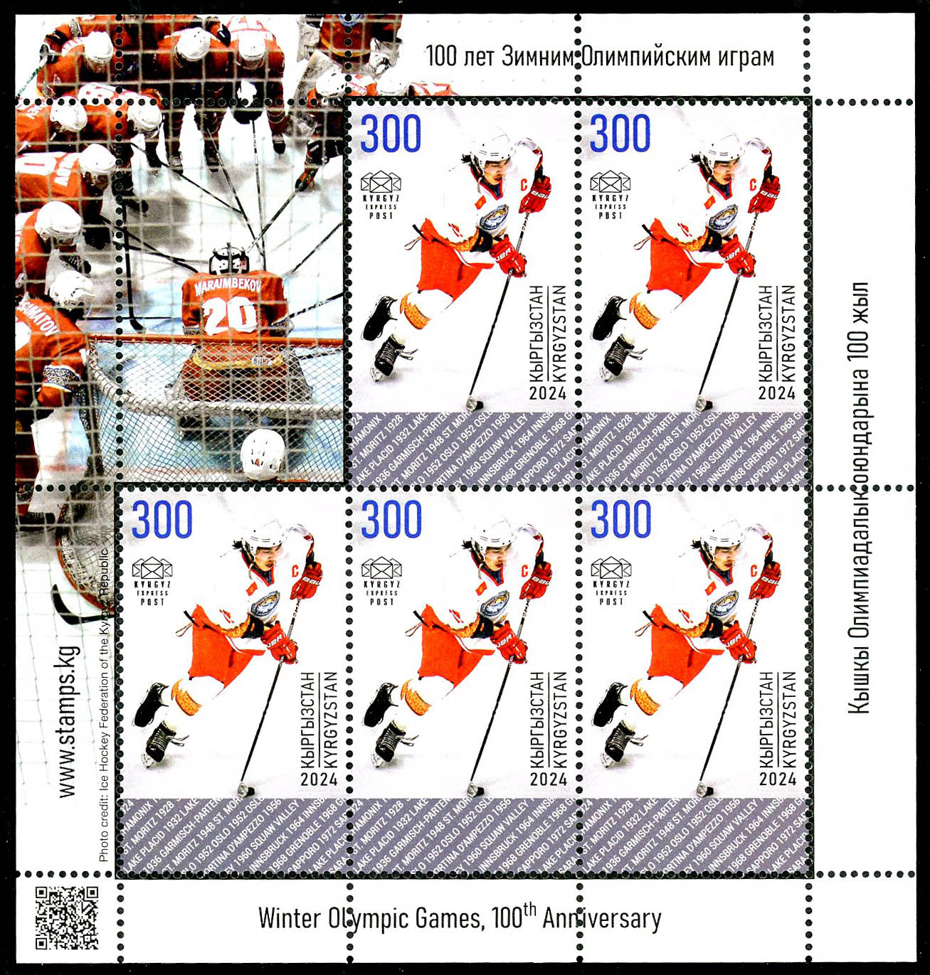 Click here for higher resolution image Click here to see FDC's | First day of issue: June 27, 2025 Width: 108 mm Height: 113 mm Perforation: Perforated 14.50 x 14.00 Printing method: Offset lithography Printer: Nova Imprim, Chisinau, Moldova Quantity printed: 1,000 Creative team: Daria Maier, Designer Location: Ice Hockey Volume LXIII Stamp ID = 9221 Stamp was issued to celebrate the 100 year anniversary of the Winter Olympics. Miniature sheet shows Ersultan Mirbekov From Linn's "Stamp Issuing Entities Of The World" page. Kyrgyzstan (1992-) Stamp-issuing status: active. Population: 3,858,736. Republic in central Asia, situated between Kazakstan, Uzbekistan, Tajikistan and China. |