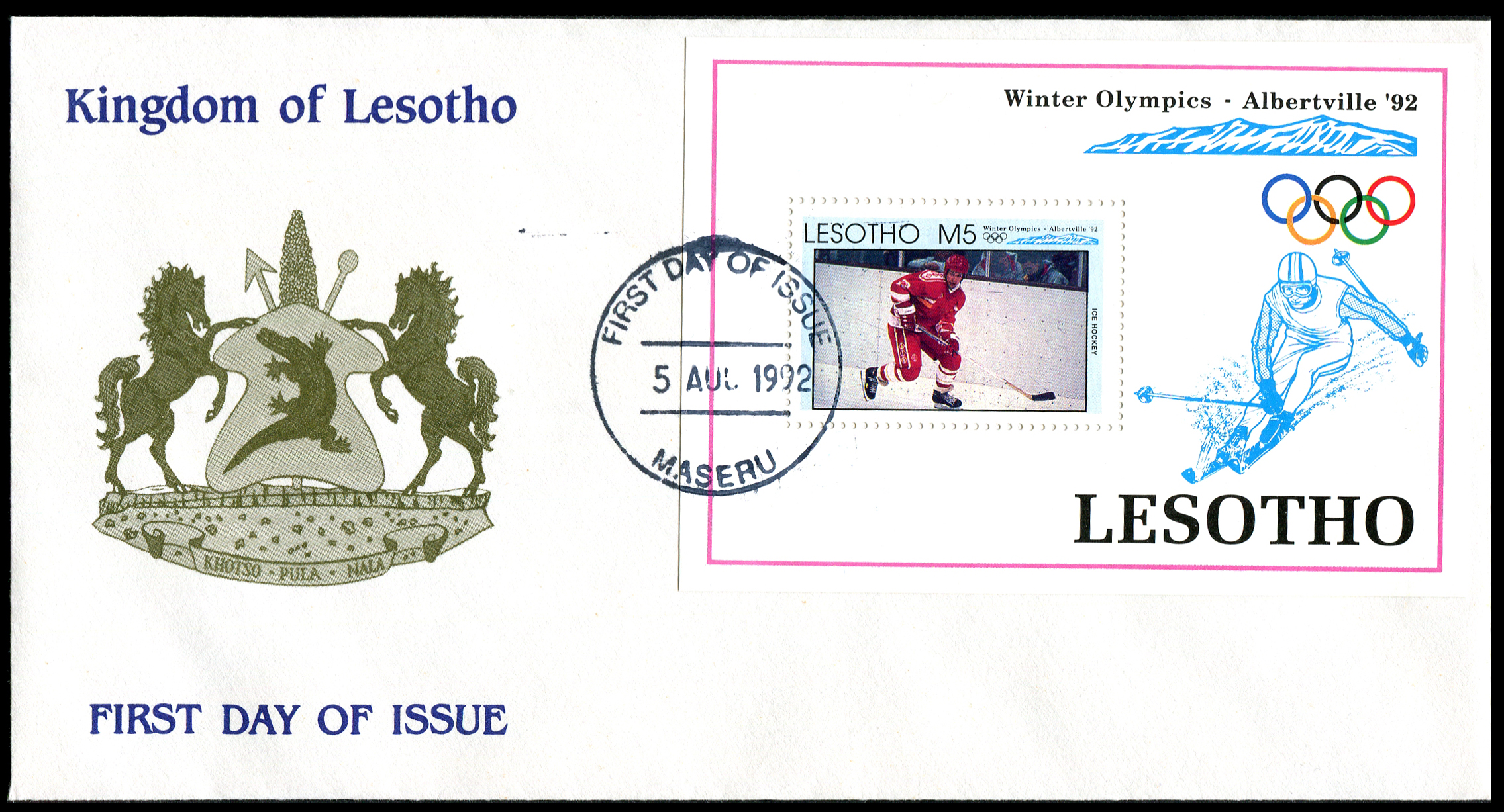 Click here for higher resolution image | First Day Cover for les-19920805-w-001 First day of issue: August 05, 1992 Width: 186 mm Height: 96 mm Cachet maker: Unknown Location: Ice Hockey Volume LXIV Idfdc = 417 From Linn's "Stamp Issuing Entities Of The World" page. Lesotho (1966-) Stamp-issuing status: active; Population: 2,007,814. A kingdom in southern Africa, surrounded by the Republic of South Africa. |