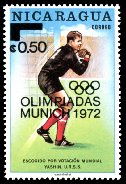 Click here for higher resolution image | First day of issue: March 20, 1972 Width: 32 mm Height: 48 mm Perforation: Perforated 13.50 x 13.50 Printing method: Lithographed Catalog number: Scott 900 Location: Ice Hockey Volume LXIX Stamp ID = 6201 Although best know as a soccer goal keeper, Lev Yashin, was also an ice hockey goalie. From Wikipedia Yashin also played ice hockey (also as a goalkeeper) and he won the Soviet Cup in March 1953. He stopped playing ice hockey in 1954 to concentrate on his football career. This stamp was issued for the 1972 Olympics in Munich, Germany from August 26 through September 10. The stamp is nic-19700511-s-001 surcharged and overprinted with The back of the stamp is printed in black with Yashin's name and accomplishments From Linn's "Stamp Issuing Entities Of The World" page. |