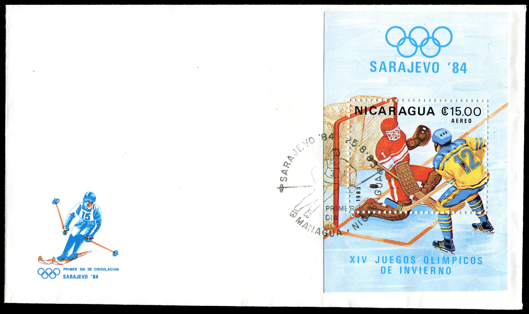 Click here for higher resolution image | First Day Cover for nic-19830825-w-001 First day of issue: August 25, 1983 Width: 146 mm Height: 84 mm Cachet maker: Unknown Location: Ice Hockey Volume LXIX Idfdc = 453 From Linn's "Stamp Issuing Entities Of The World" page. Nicaragua (1862-) Stamp-issuing status: active; Population: 4,386,399 (1997). A republic in Central America. |