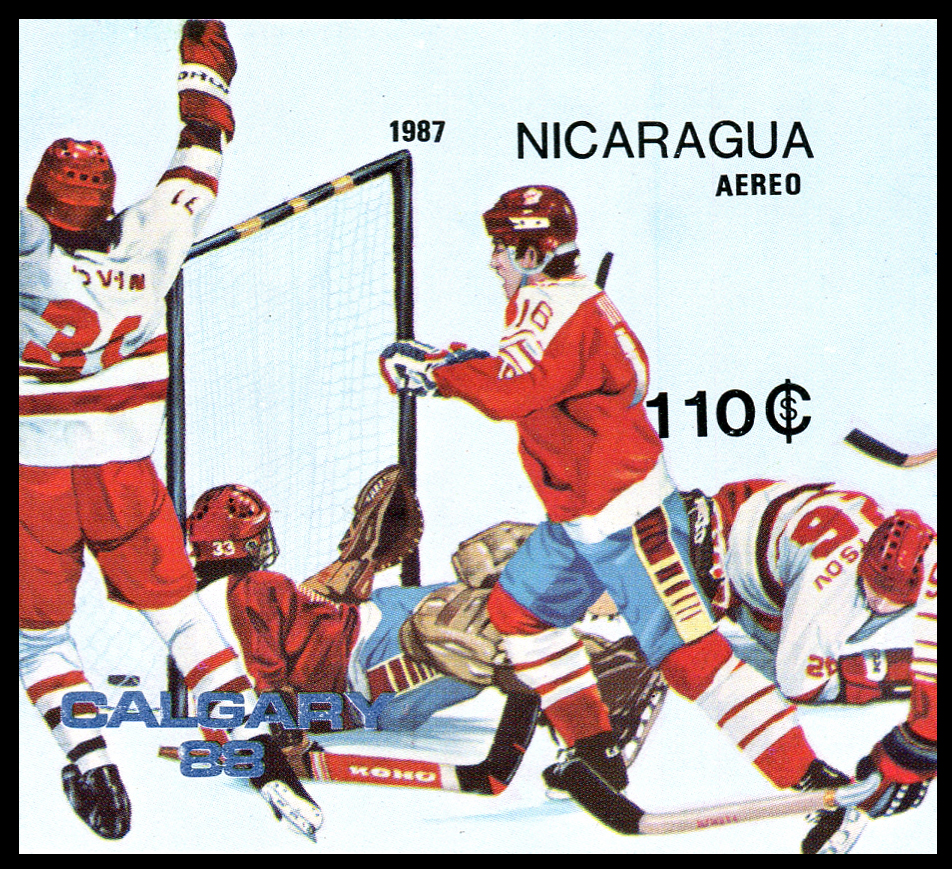 Click here for higher resolution image | First day of issue: February 03, 1987 Occasion: 1988 Winter Olympics,1988,Calgary,Canada Width: 75 mm Height: 67 mm Perforation: Imperforate Location: Ice Hockey Volume LXIX Stamp ID = 3086 From Linn's "Stamp Issuing Entities Of The World" page. Nicaragua (1862-) Stamp-issuing status: active; Population: 4,386,399 (1997). A republic in Central America. |