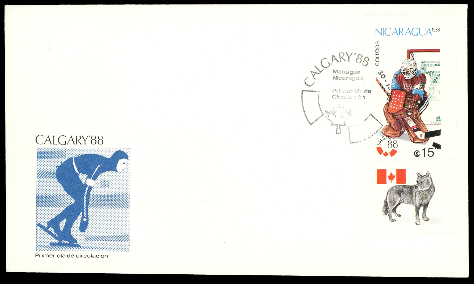 Click here for higher resolution image | First Day Cover for nic-19880130-s-001 First day of issue: January 30, 1988 Width: 152 mm Height: 87 mm Cachet maker: Unknown Location: Ice Hockey Volume LXIX Idfdc = 1914 From Linn's "Stamp Issuing Entities Of The World" page. Nicaragua (1862-) Stamp-issuing status: active; Population: 4,386,399 (1997). A republic in Central America. |