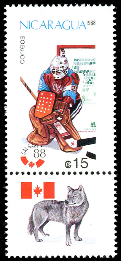 Click here for higher resolution image Click here to see FDC's | First day of issue: January 30, 1988 Occasion: 1988 Winter Olympics,1988,Calgary,Canada Width: 25 mm Height: 42 mm Perforation: Perforated 12.50 x 12.50 Catalog number: Scott 1677 Location: Ice Hockey Volume LXIX Stamp ID = 3087 From Linn's "Stamp Issuing Entities Of The World" page. Nicaragua (1862-) Stamp-issuing status: active; Population: 4,386,399 (1997). A republic in Central America. |
