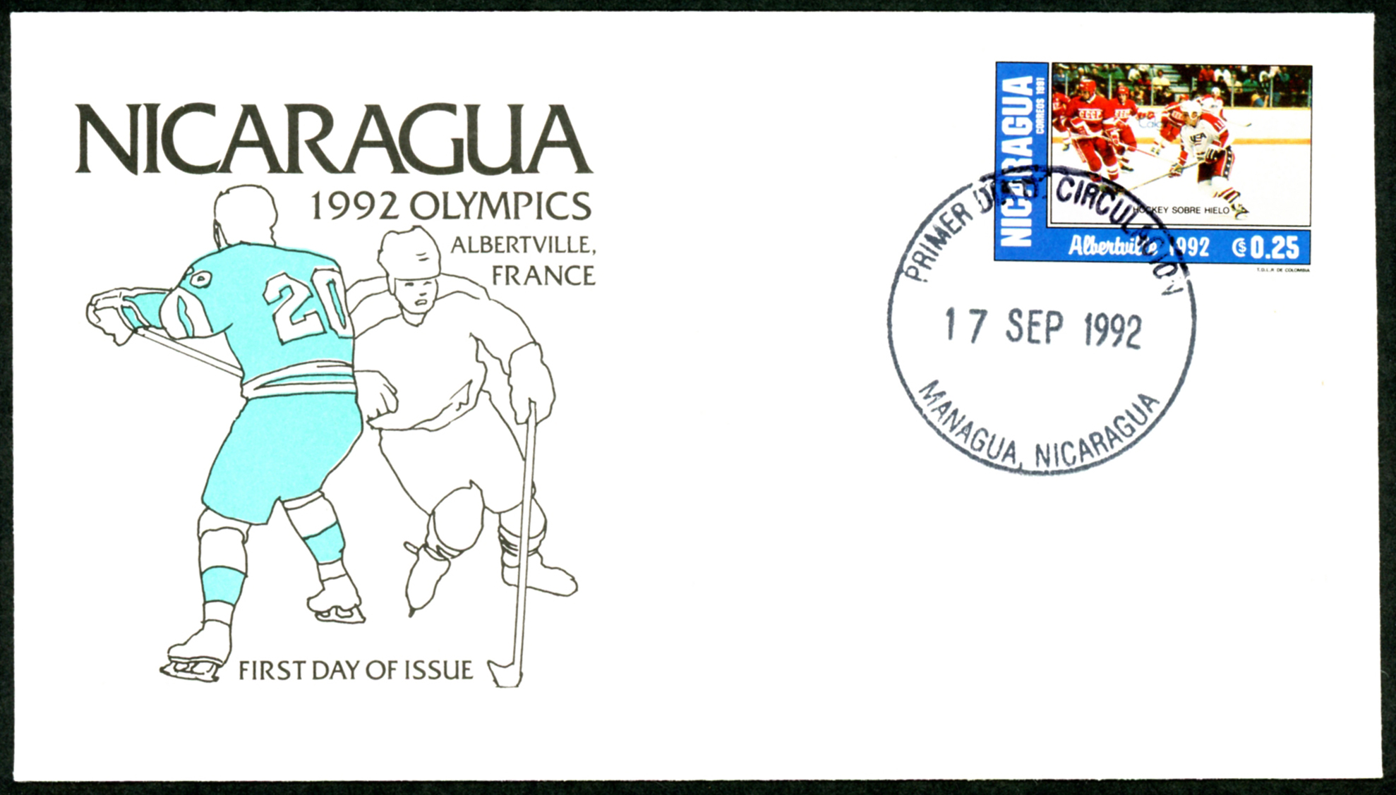 Click here for higher resolution image | First Day Cover for nic-19920917-s-001 First day of issue: September 17, 1992 Width: 165 mm Height: 92 mm Cachet maker: Unknown Location: Ice Hockey Volume LXIX Idfdc = 1834 From Linn's "Stamp Issuing Entities Of The World" page. Nicaragua (1862-) Stamp-issuing status: active; Population: 4,386,399 (1997). A republic in Central America. |