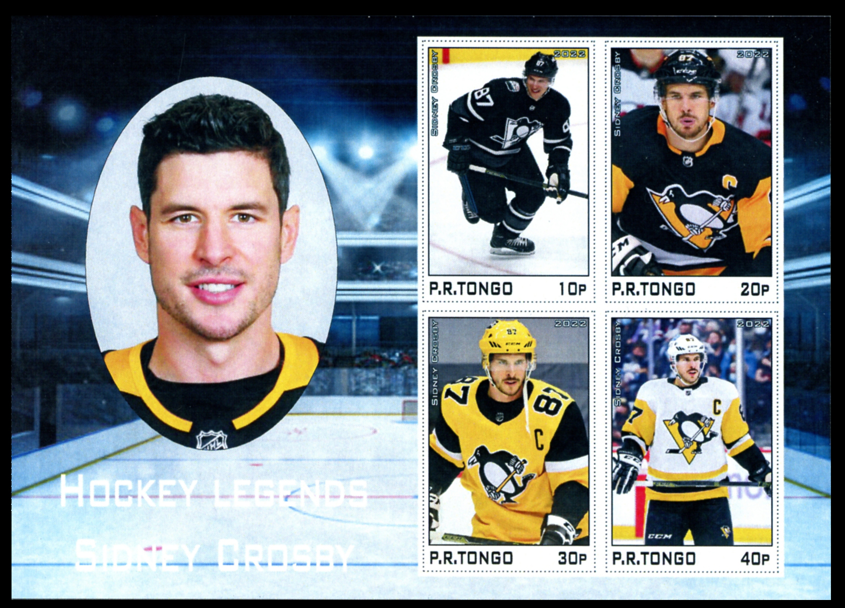 Click here for higher resolution image | First day of issue: Date unknown Width: 138 mm Height: 99 mm Perforation: Imperforate Location: Ice Hockey Volume LXXII Stamp ID = 7175 This collective sheet has 1 copy each of the following four items Cinderella, collective sheet shows Sidney Crosby Imaginary country. No information about this country available but one source on-line thought that labels coming from P.R.Tongo are produced by a company in the Netherlands. |